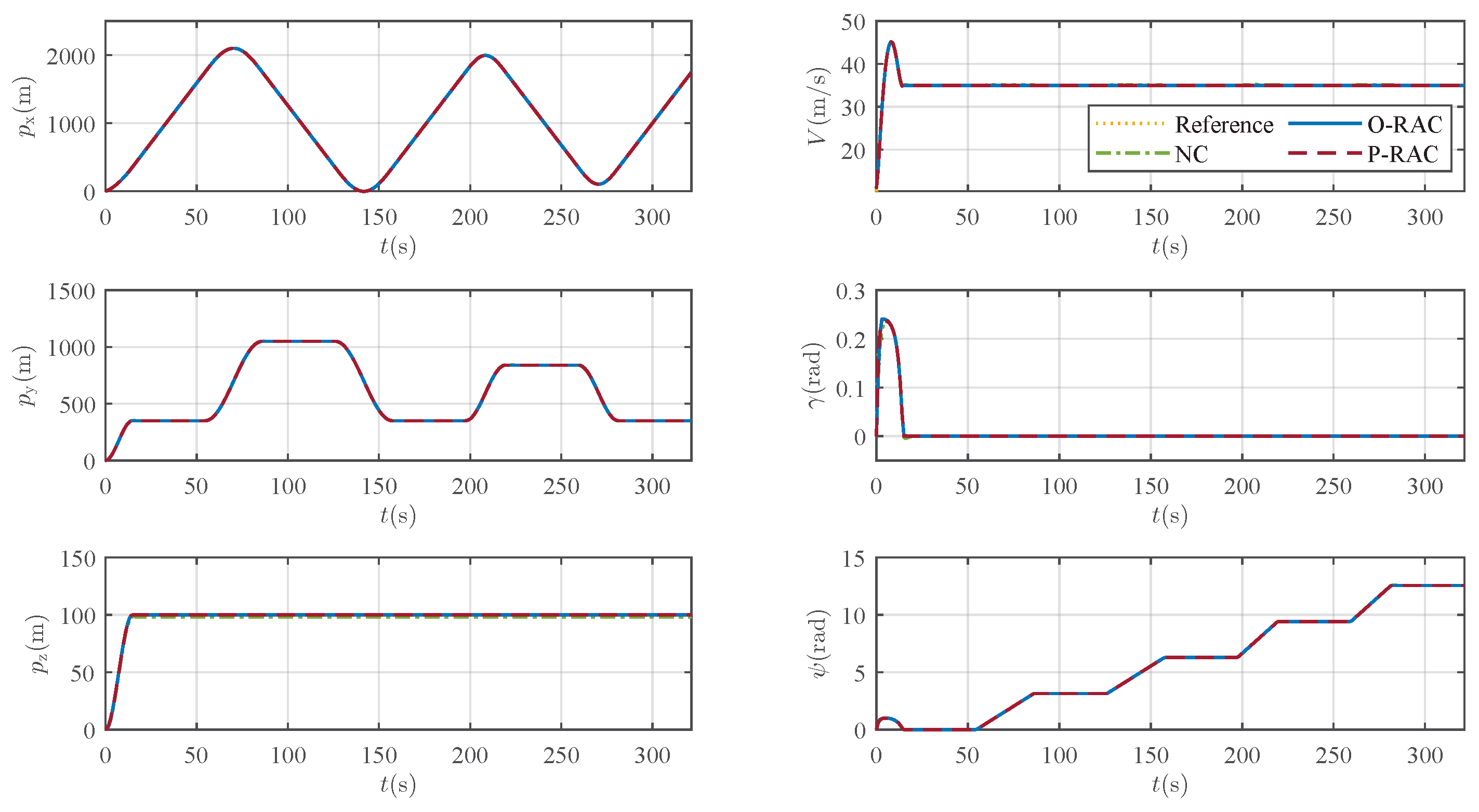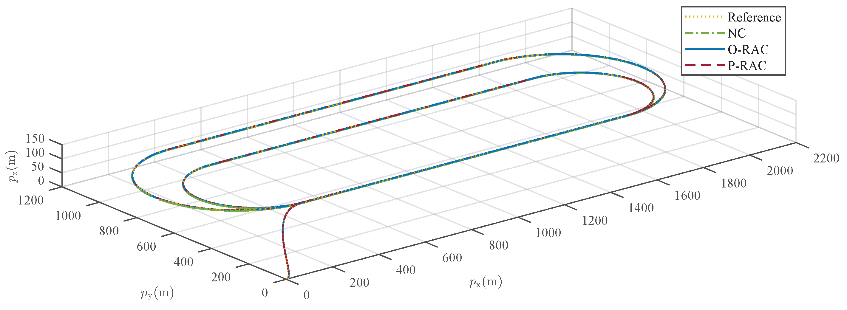 Figure 10 is negligible compared to the scale of the entire flight trajectory (on the order of hundreds of meters), all three control laws, from a macroscopic perspective, enable the UAV to track the reference trajectory. This is visually confirmed by the nearly imperceptible trajectory deviations in