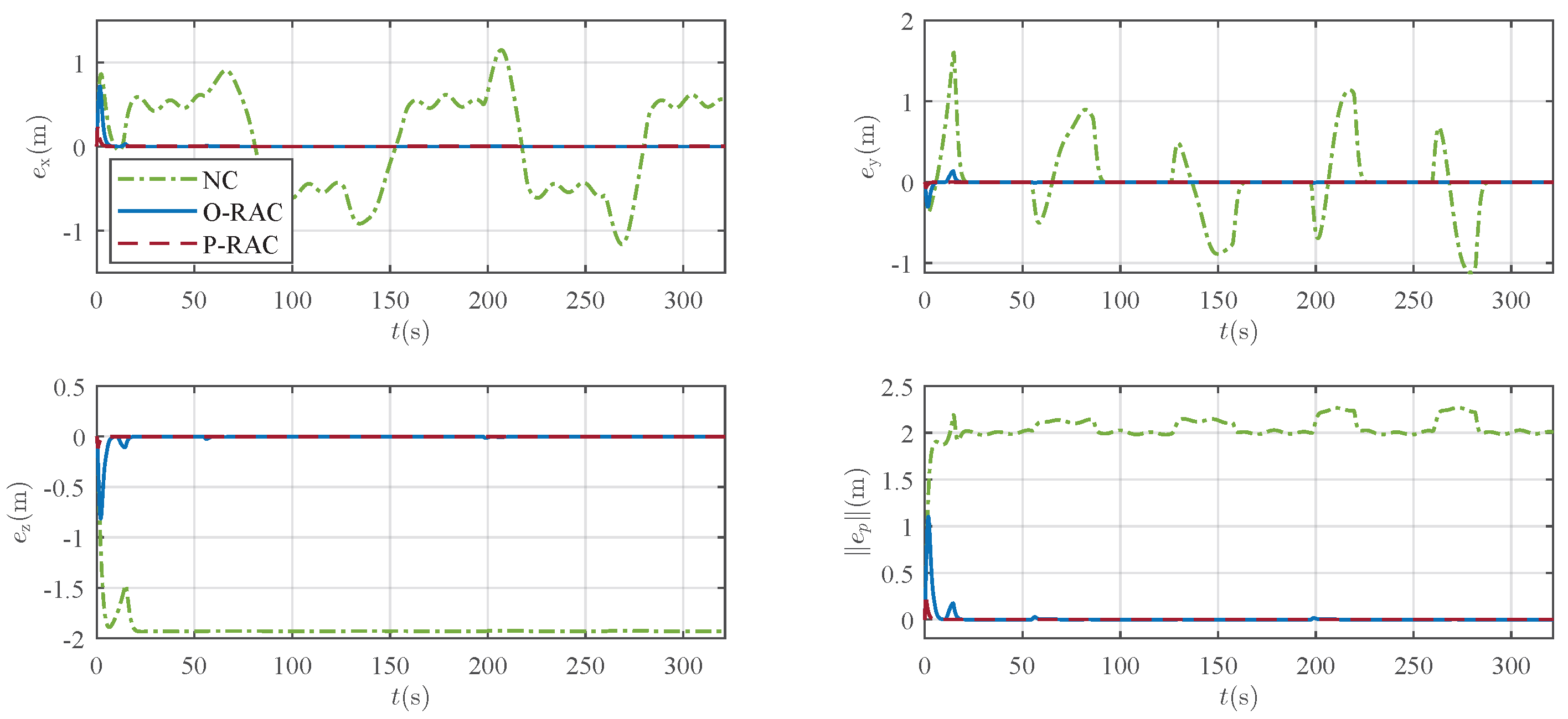 Figure 10 reveals that the controllers exhibit significant differences in performance. The tracking under NC exhibits a relatively pronounced error, with a peak value exceeding 2 m, and a steady-state error of approximately 2 m is observed. In contrast, the tracking performance is substantially improved with the introduction of robust compensation in O-RAC and P-RAC. Specifically, they exhibit a faster convergence speed, ultimately settling the steady-state error within a small neighborhood of zero. As reported in