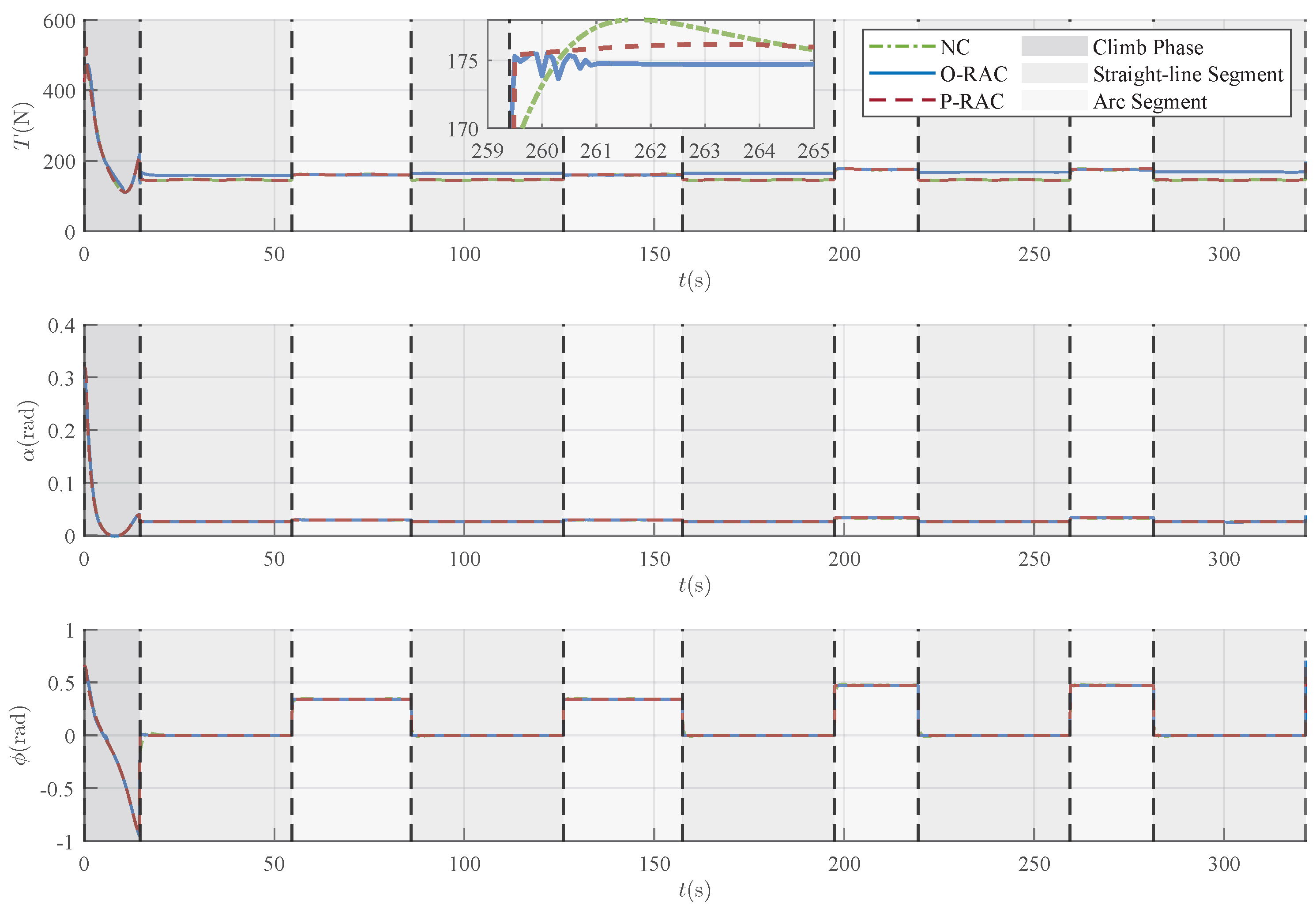 T varies smoothly, mostly between 140 N and 160 N. While these results are specific to the simulated scenario, the smoothness and the reasonable magnitude of the commands, especially during the cruising and maneuvering phase, strongly suggest that they represent a feasible operational envelope. It is reasonable to expect that a standard, well-tuned attitude controller could track these commands without encountering actuator saturation under similar flight conditions.