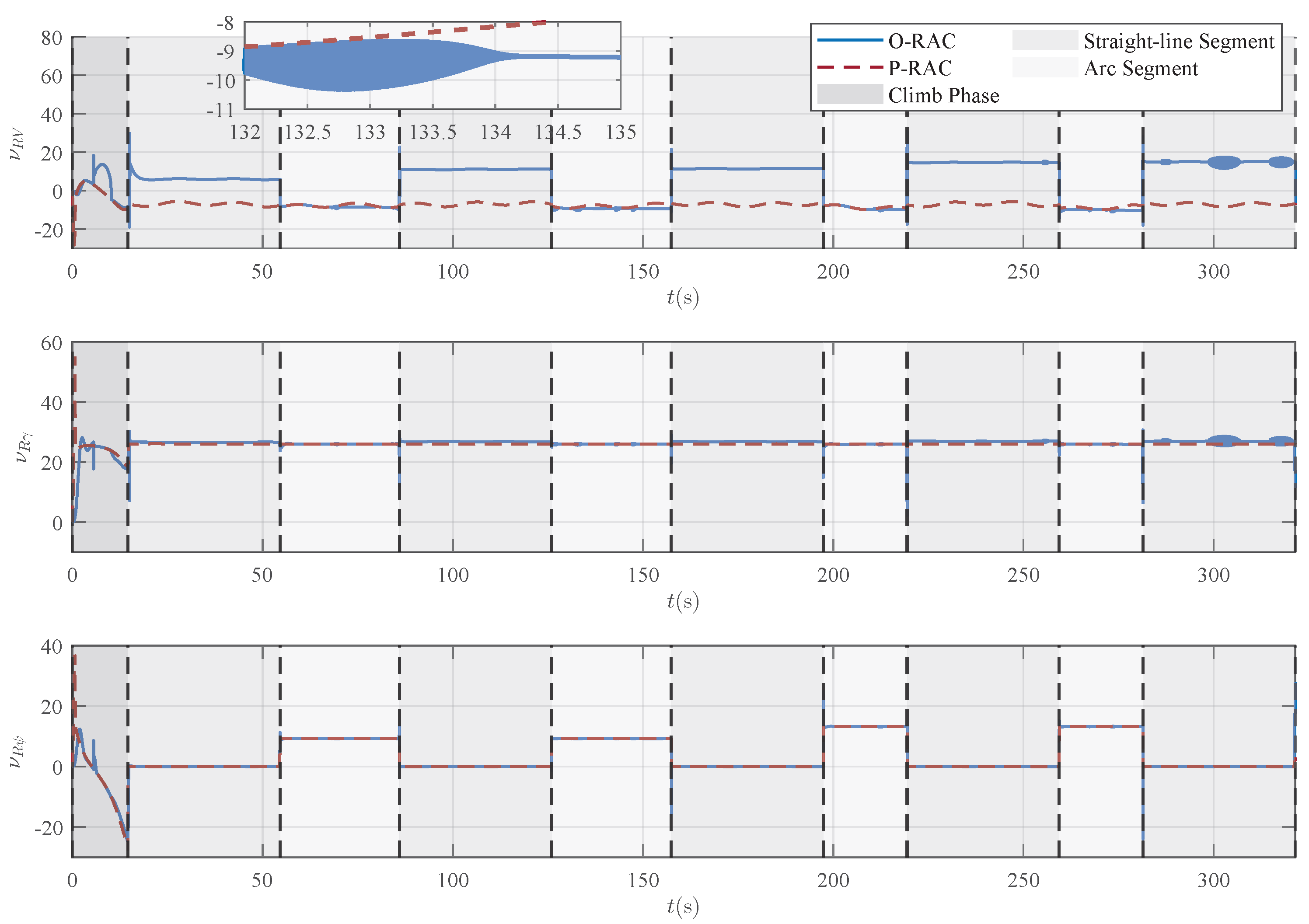 Figure 12 reveals that the control signals under O-RAC exhibit significant oscillations (chattering), whereas the control signals of P-RAC are relatively smooth. According to Equation (