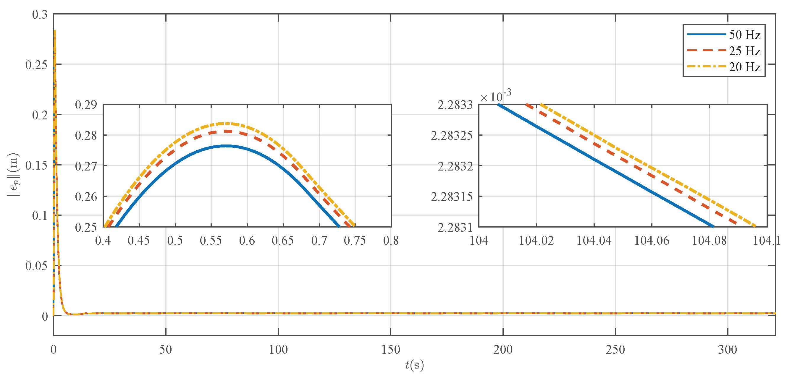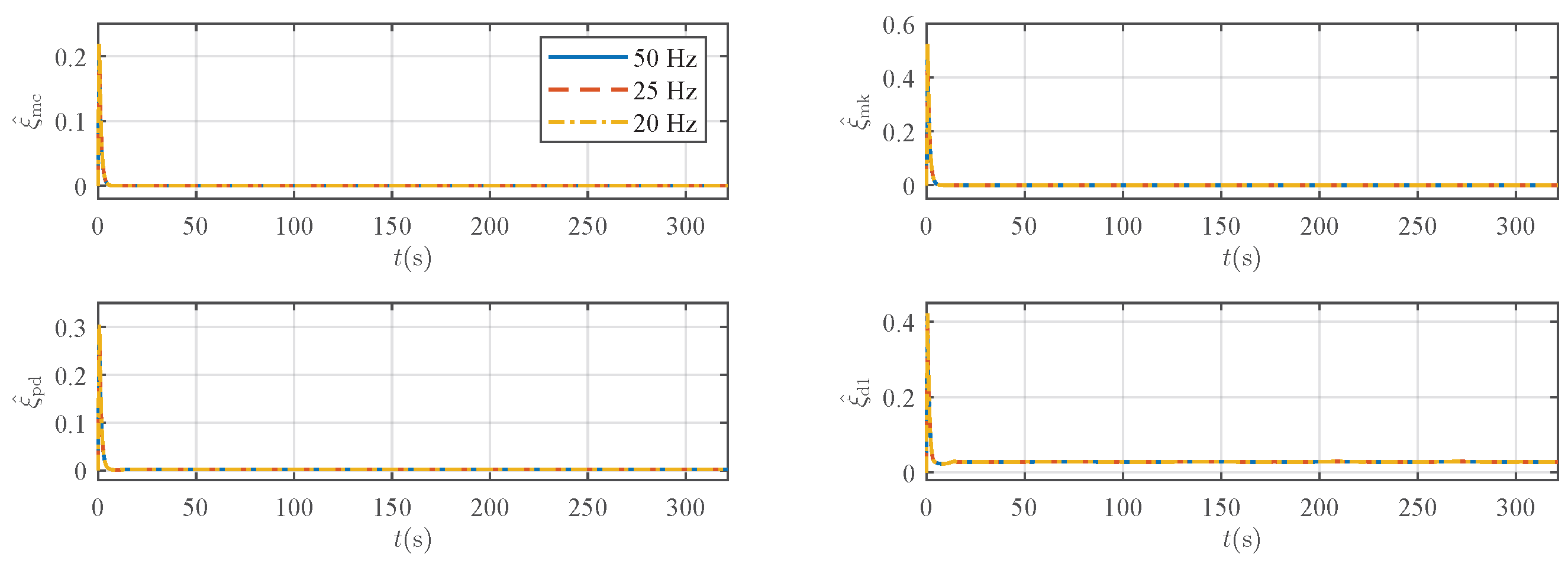 Table 4 indicate that the trajectory tracking error gradually increases as the sampling frequency is reduced. This observation is corroborated by the deviation in the adaptive parameter trajectories under discretization when compared to the continuous-time benchmark (