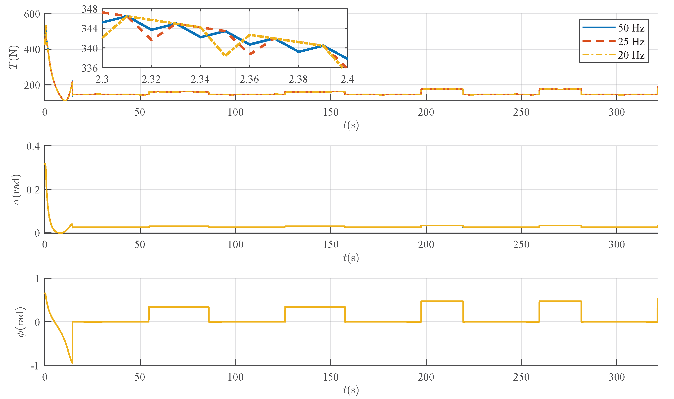 In practical applications, limitations in hardware performance and computational resources often constrain the update frequency of the control law. Therefore, to assess the suitability and practicality of P-RAC for implementation on a digital flight computer, this subsection investigates the impact of the controller’s sampling frequency on tracking performance. The continuous-time P-RAC is discretized and simulated respectively at typical sampling frequencies of , , and .