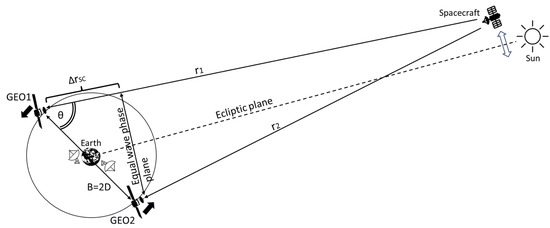 STK orbital scenario: A representative deep space mission geometry was modeled using the Sun–Earth Lagrangian point L1 (SEL1) as an example target. Two GEO satellites were placed in dual longitude slots, creating a long interferometric baseline. STK provides the orbital dynamics, including relative positions, velocities, and baseline–spacecraft angles (). While SEL1 is used as a reference case, the geometric considerations and availability analysis are generally applicable to any deep space target located in the ecliptic plane.