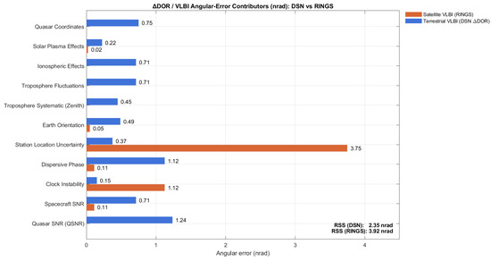 Table 3 summarizes the error contributions for both traditional terrestrial VLBI and the proposed GEO-based VLBI configuration (RINGS). We adopted the same error budget methodology used for ground-based VLBI and Delta-DOR systems, as extensively detailed in [