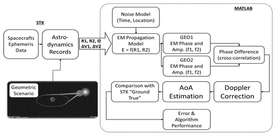 MATLAB interferometric model: Custom MATLAB code emulates the full radiometric interferometry process. The model includes electromagnetic wave propagation from the spacecraft, phase sampling at the GEO receivers, dual-frequency processing, and cross-correlation to extract the differential phase. The simulation structure is illustrated in
