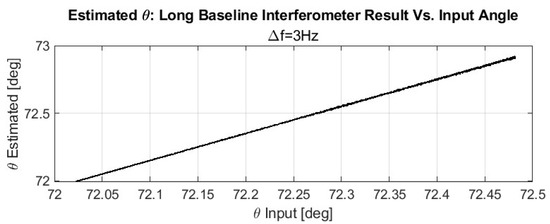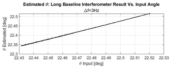 We evaluated the interferometric angle-of-arrival (AoA) estimator for two representative baseline–spacecraft geometries: (i) (short projected baseline; elevation-sensitive) and (ii) (long projected baseline; azimuth-sensitive). Each session used s with two sampling cadences, (100 Hz and 1 kHz). For this first-stage demonstration, we chose an S-band carrier at GHz (rather than the Ka-band used in the error analysis) to operate within a more relaxed ambiguity and link-budget regime while keeping the same estimation principles; the methodology directly carries over to higher frequencies.