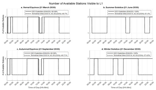 A full-year simulation for 2030 was conducted using STK, sampling LOS conditions every 10 min. While SEL1 served as the reference target, similar availability outcomes are expected for any deep space mission within the ecliptic plane, given the geometry of GEO satellite coverage.
