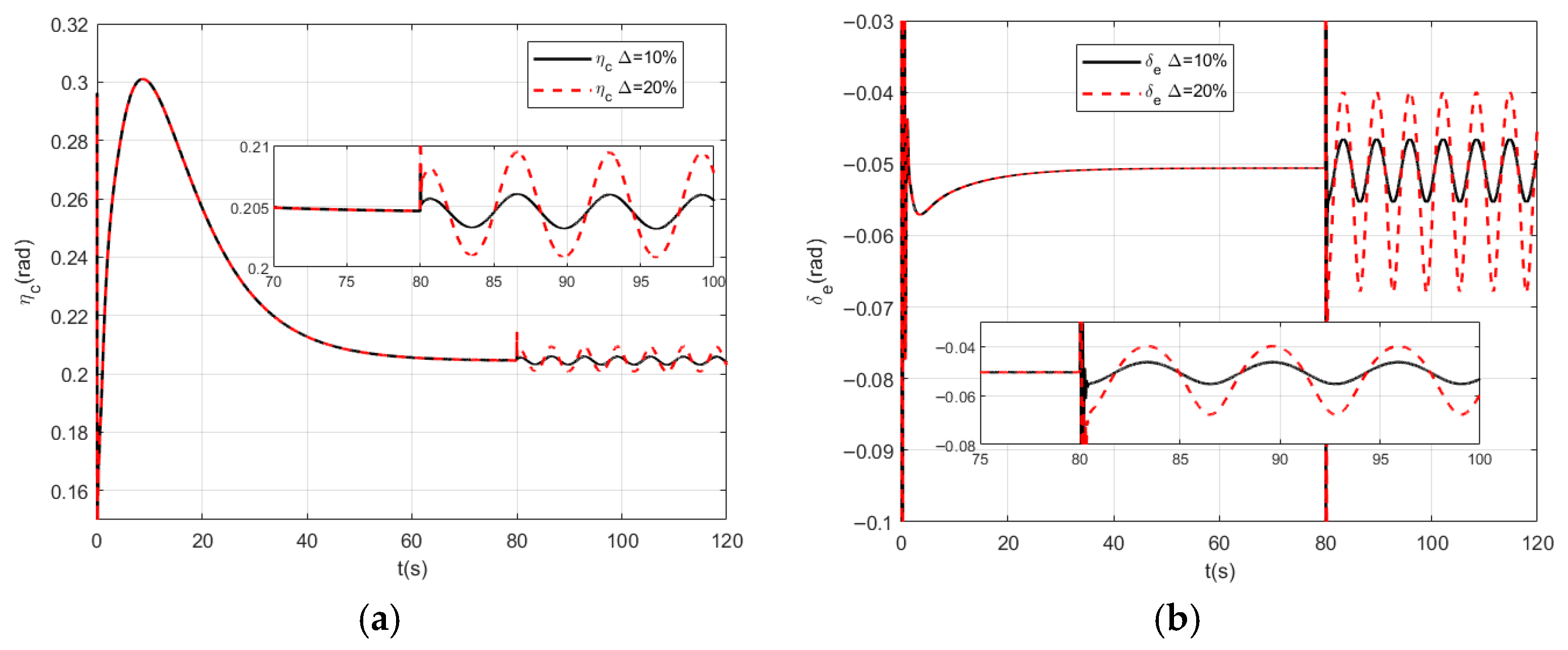 Figure 2 displays the velocity error response curve and the altitude error response curve. As observed in the figure, under a 10% parameter perturbation, the velocity tracking error remains below 0.05, while the altitude tracking error stays under 0.02. When the parameter perturbation increases to 20%, the velocity tracking error is less than 0.08, and the altitude tracking error does not exceed 0.05. In contrast, the traditional DSC control method exhibits a velocity tracking error of approximately 0.1 and an altitude tracking error of about 0.06.