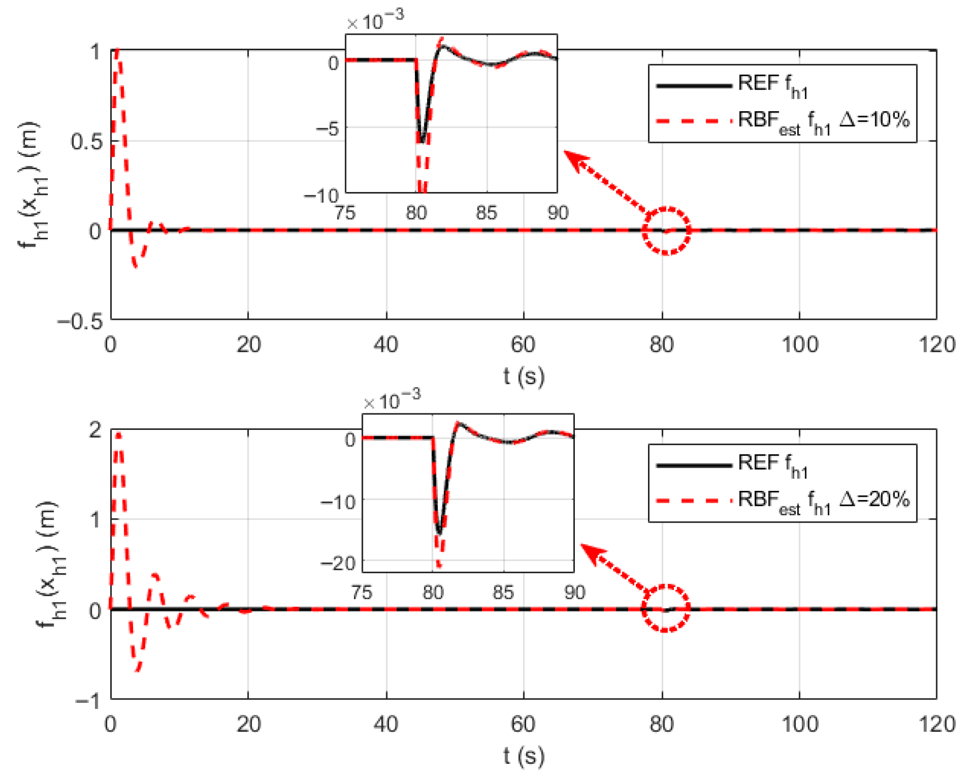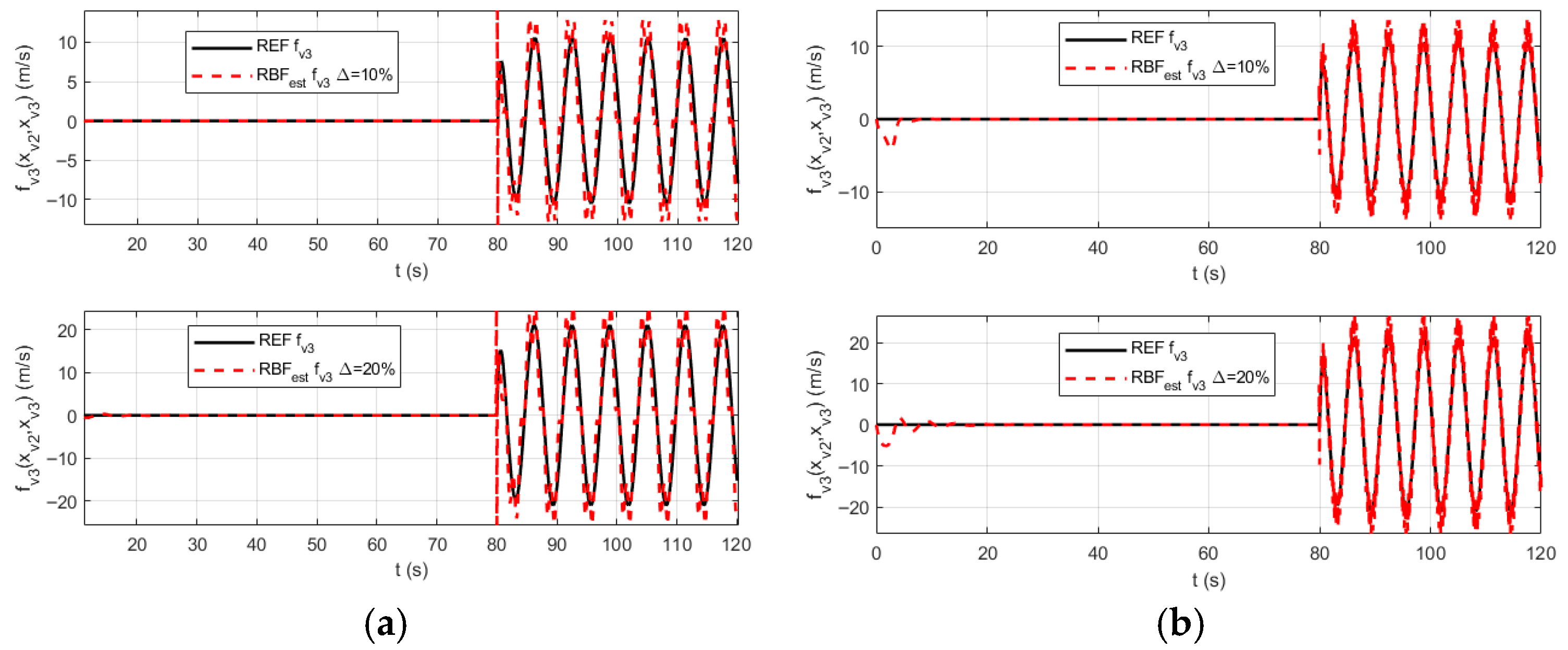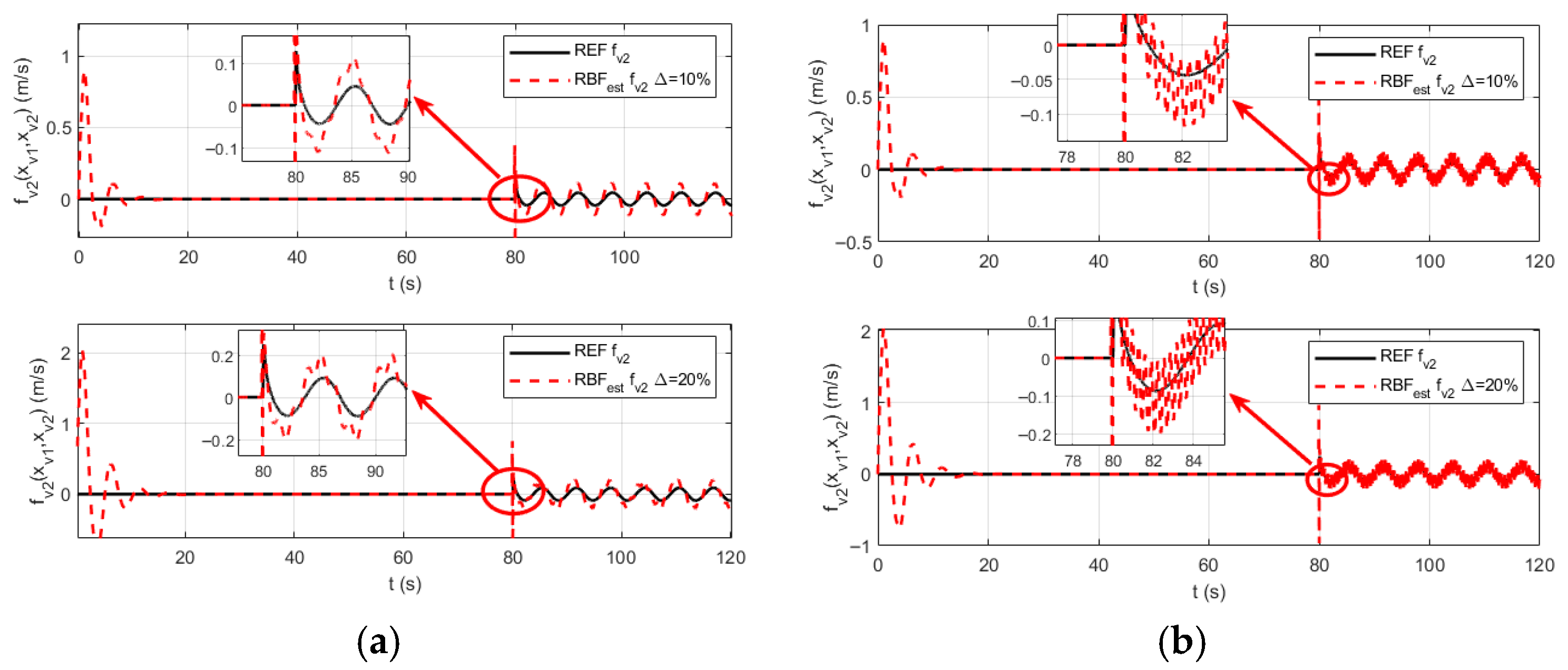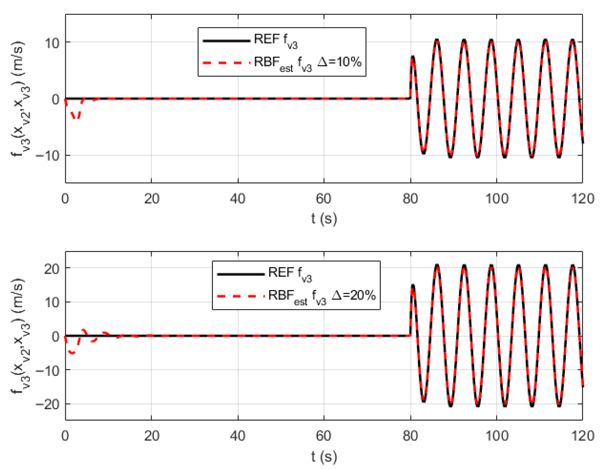 Figure 11, when the unknown functions are bivariate functions, the RBF network successfully learns such complex coupling relationships, enabling the approximation curves to closely track the reference curves. This indicates the effectiveness of the RBF network in handling multi-input nonlinear mapping problems.