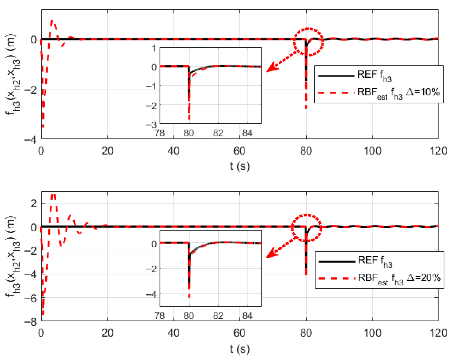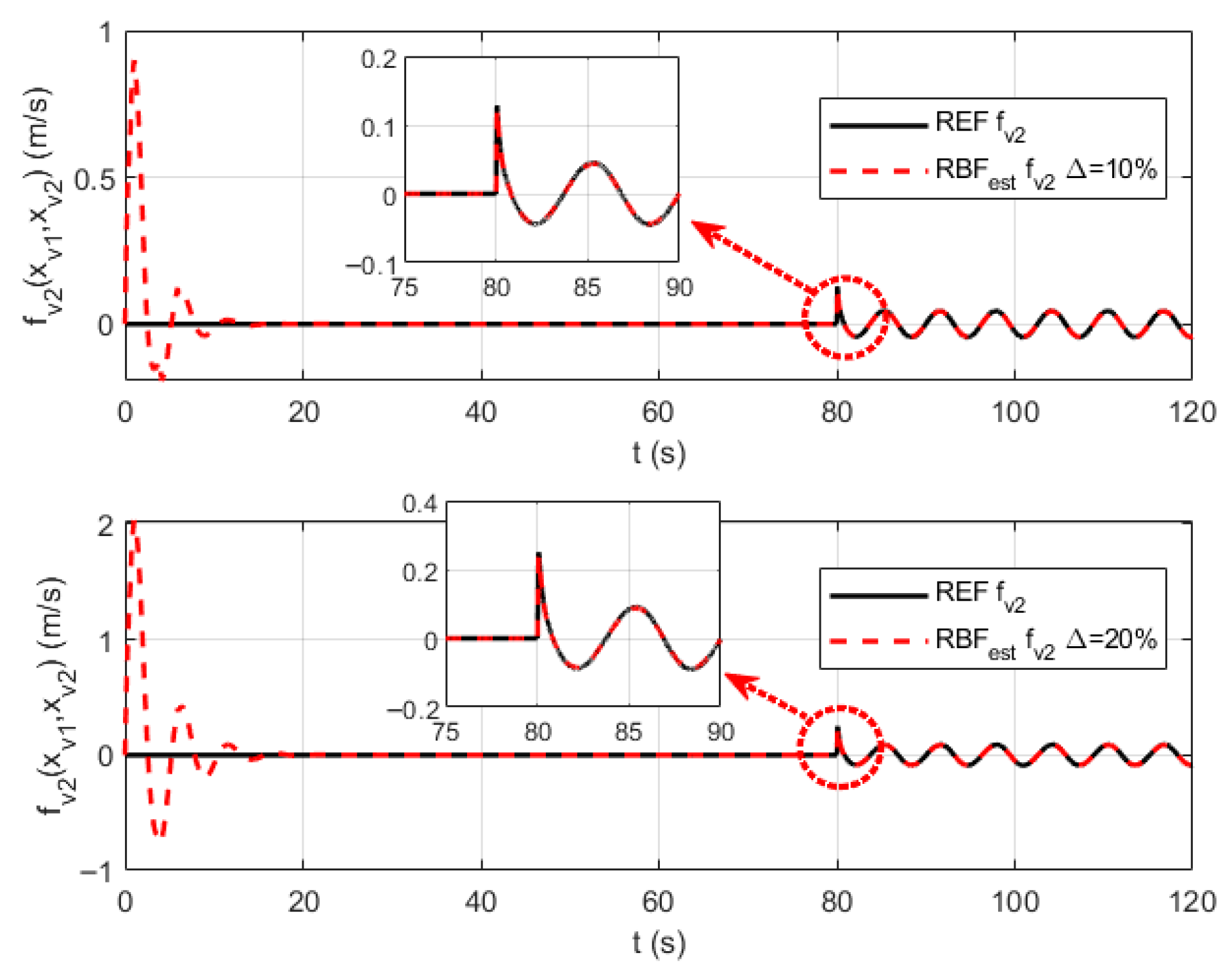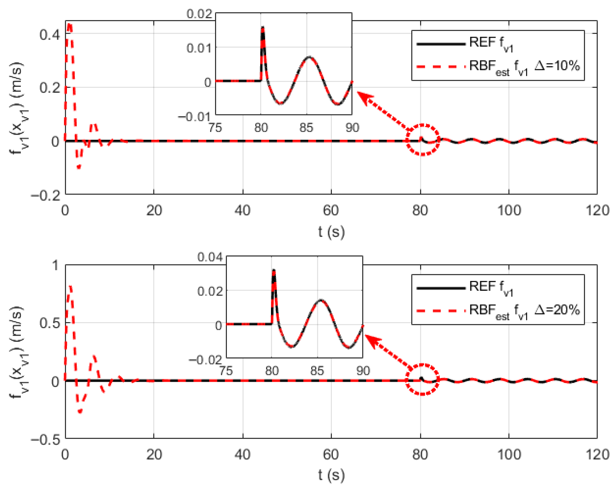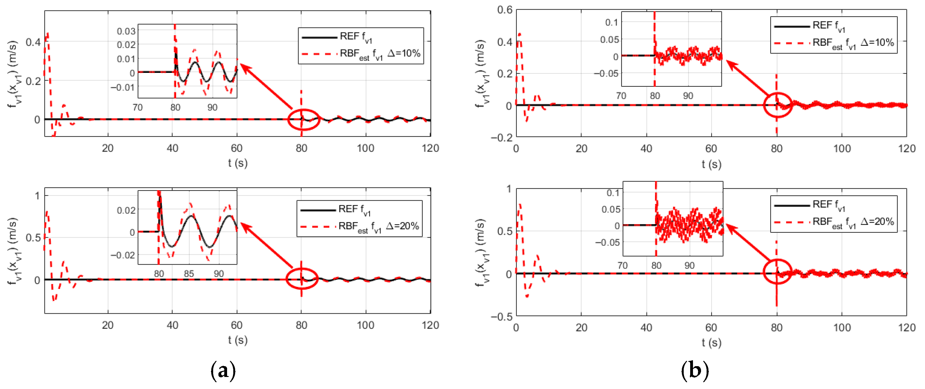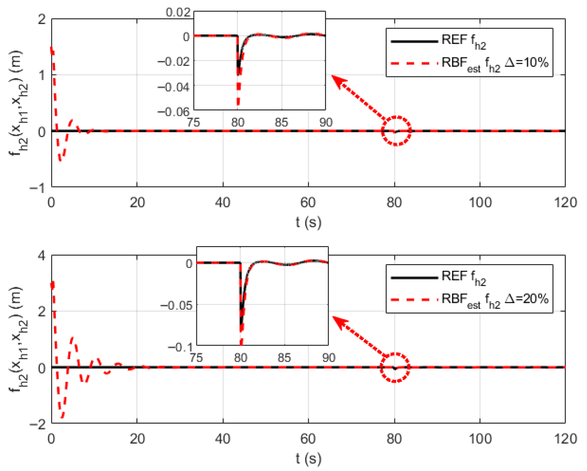 Figure 11, when the unknown functions are bivariate functions, the RBF network successfully learns such complex coupling relationships, enabling the approximation curves to closely track the reference curves. This indicates the effectiveness of the RBF network in handling multi-input nonlinear mapping problems.