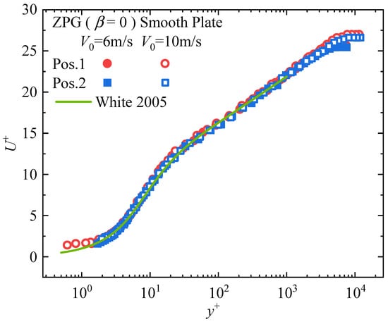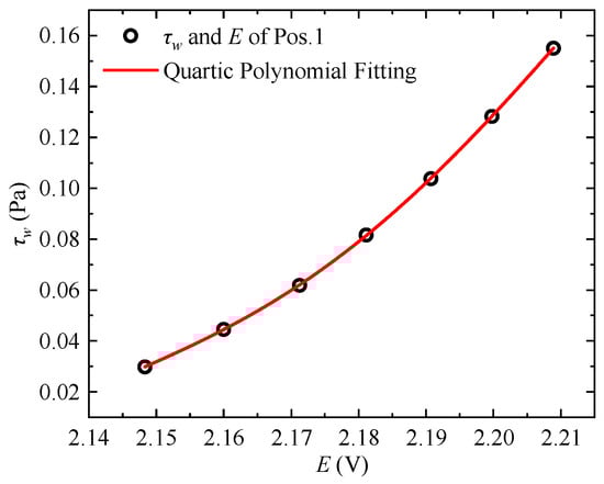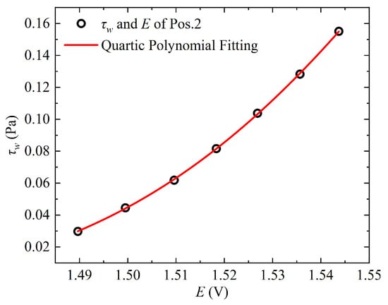 Simultaneous measurements of the viscous sublayer velocity profiles at Measurement Position 1 (Pos. 1) and Position 2 (Pos. 2) were conducted using hot-wire probes under various freestream velocities. The wall shear stress was determined through linear fitting of the velocity gradient in the viscous sublayer. Concurrently, the voltage outputs from the hot-film probes at both positions were recorded, and fourth-order polynomial fitting was applied to establish the calibration curves, as shown in