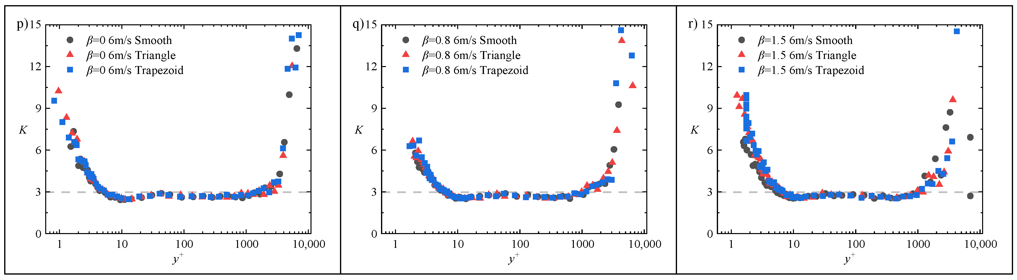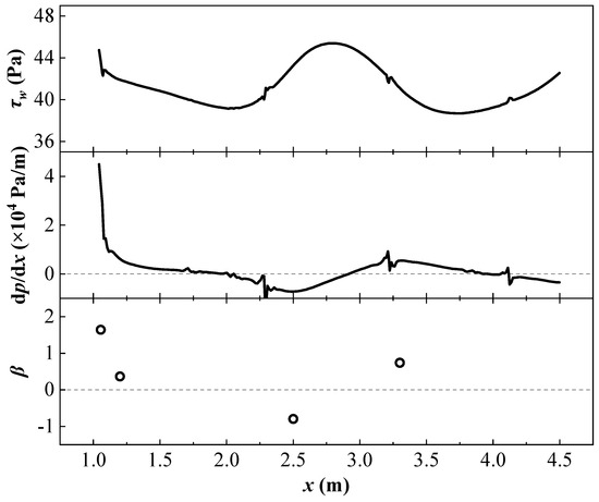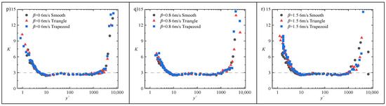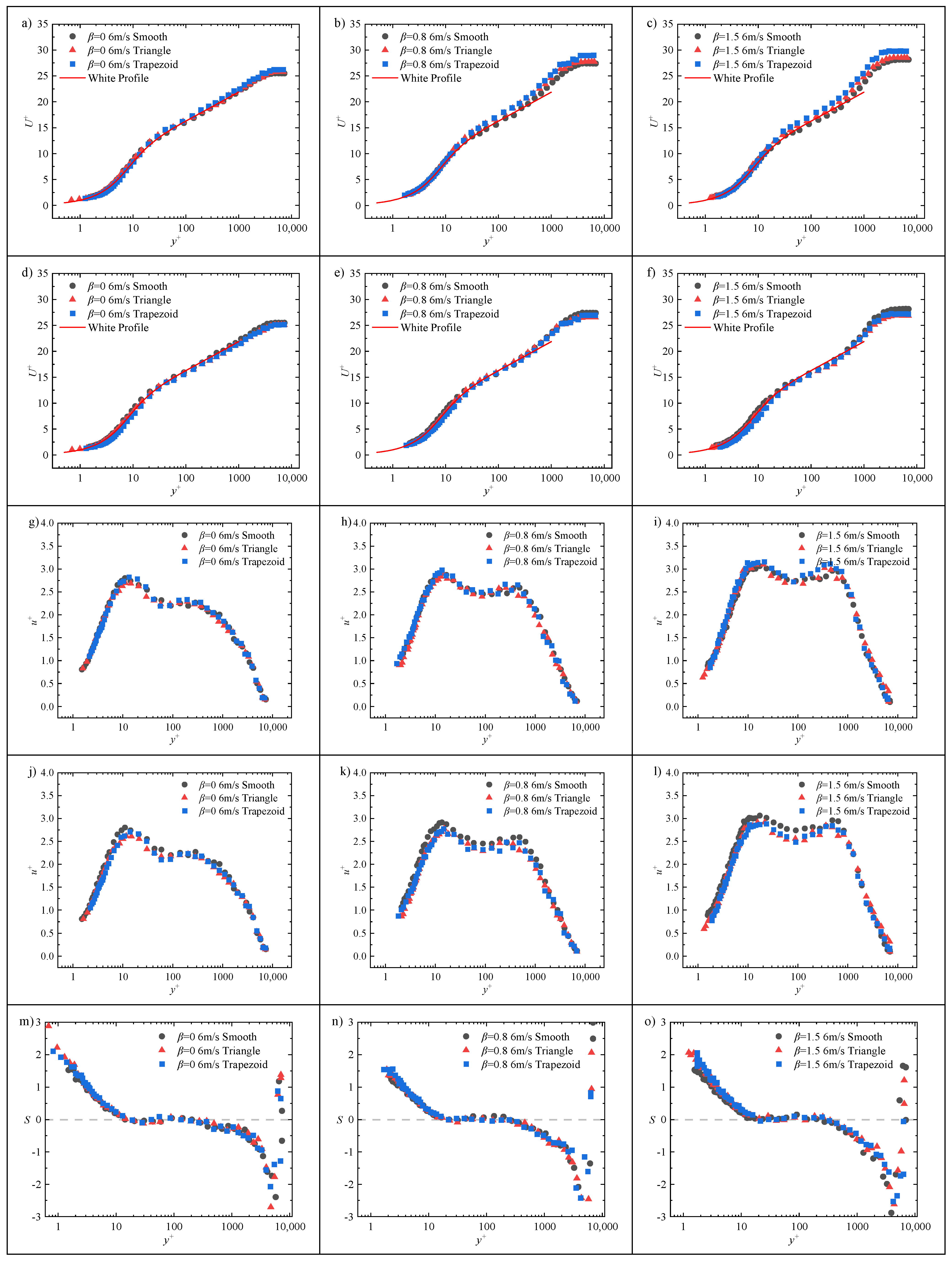 Moreover, as the adverse pressure gradient intensifies, both types of riblets maintain consistent trends in the velocity profile shift . At β = 1.5, this shift effect becomes particularly pronounced. When normalized using the smooth-wall friction velocity , the logarithmic regions of the velocity profiles regain coincidence. However, a velocity deficit emerges within the range of , and the magnitude of this deficit is positively correlated with the drag reduction rate. Since the same is used for non-dimensionalization, the non-dimensional mean velocity profile effectively reflects the characteristics of the original dimensional velocity profile. Thus, at the same freestream velocity and identical wall-normal height, the local mean velocity in the viscous sublayer and buffer region of the turbulent boundary layer over the riblet surface is reduced compared to that over the smooth wall. This reduction results in a decreased slope of the linear region of the velocity profile, consequently leading to a reduction in wall shear stress. In the logarithmic region, the velocity profiles of different surface configurations resume overlapping, indicating that the local mean velocity in this region remains unaffected by the riblets. In summary, the influence of riblets on the mean velocity profile is confined to the viscous sublayer and buffer region. Therefore, the upward shift in the logarithmic region velocity profile observed when normalized using the local friction velocity is attributed to the reduction in caused by the riblets. Consequently, can serve as a quantitative measure of the change in wall shear stress.