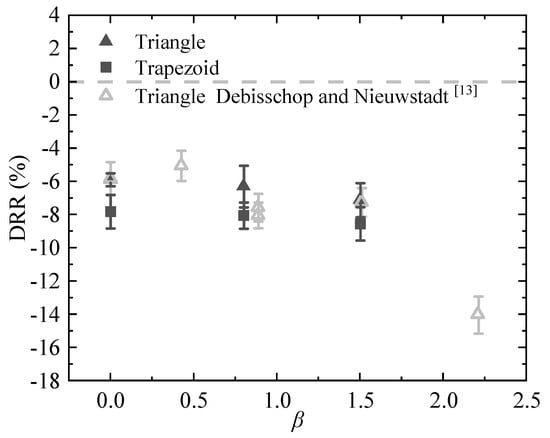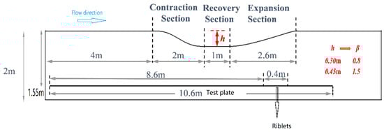 Figure 15. Debisschop and Nieuwstadt similarly constructed an adverse pressure gradient environment using a contraction–expansion section configuration. They employed an oil-floating force balance to measure the overall wall shear stress of a flat plate equipped with triangular riblets and subsequently determined the drag reduction rate by comparing these results with measurements obtained from a smooth flat plate under identical conditions. The experimental results from this study exhibit remarkable agreement with those reported by Debisschop and Nieuwstadt, providing strong mutual validation. This consistency reinforces the conclusion that a moderate adverse pressure gradient can enhance the drag reduction performance of riblets, provided it does not induce flow separation.