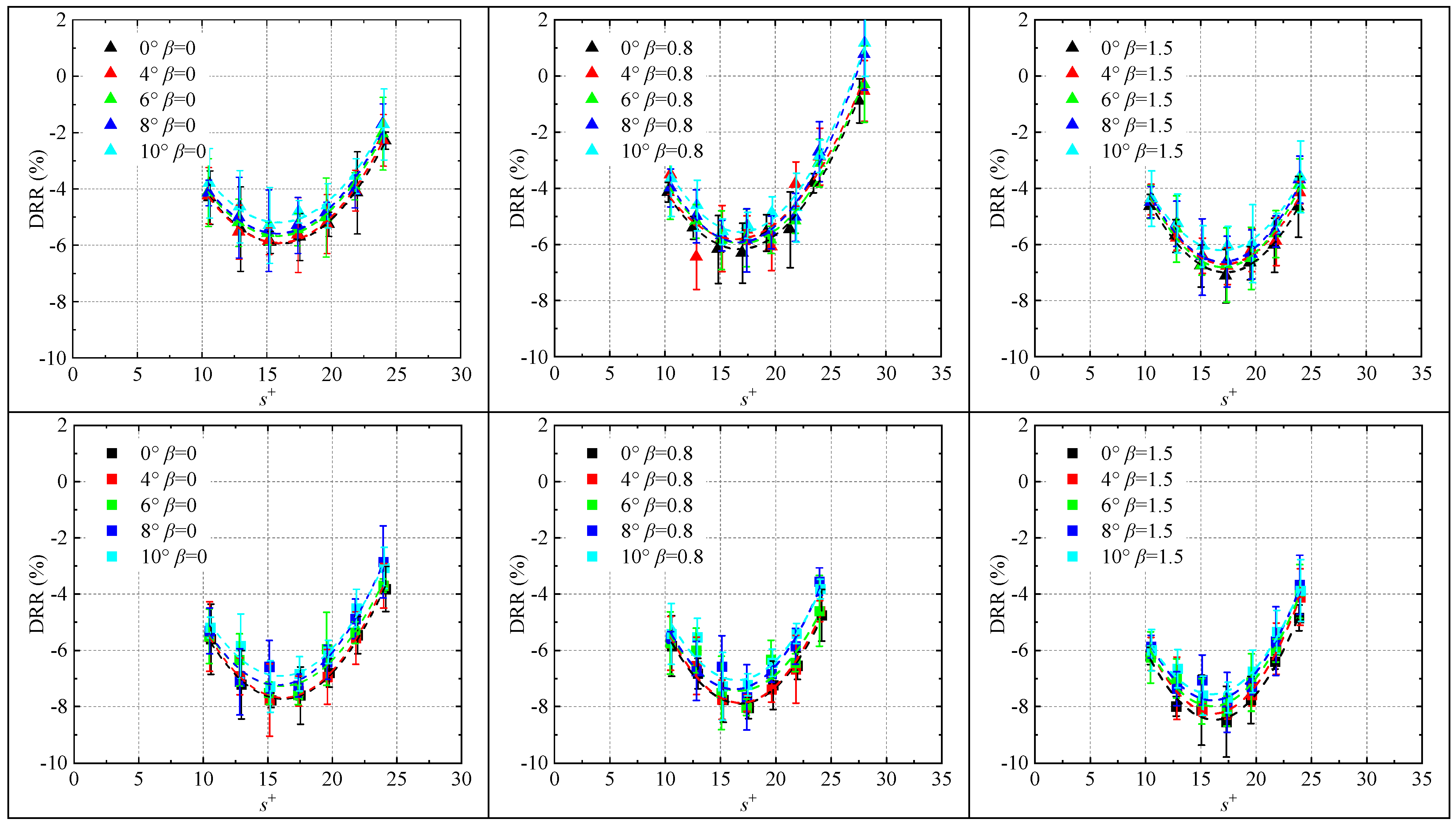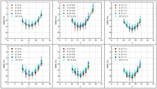 Figure 16. It is evident that under all adverse pressure gradient conditions, the drag reduction rate progressively decreases with increasing yaw angle (crossflow effects), indicating that crossflow suppresses the drag-reducing effectiveness of riblets. This finding necessitates that the design of riblet surfaces on aircraft must account for the local flow direction of the surrounding flow field. Riblets should be aligned with the actual local streamlines to optimize drag reduction performance.