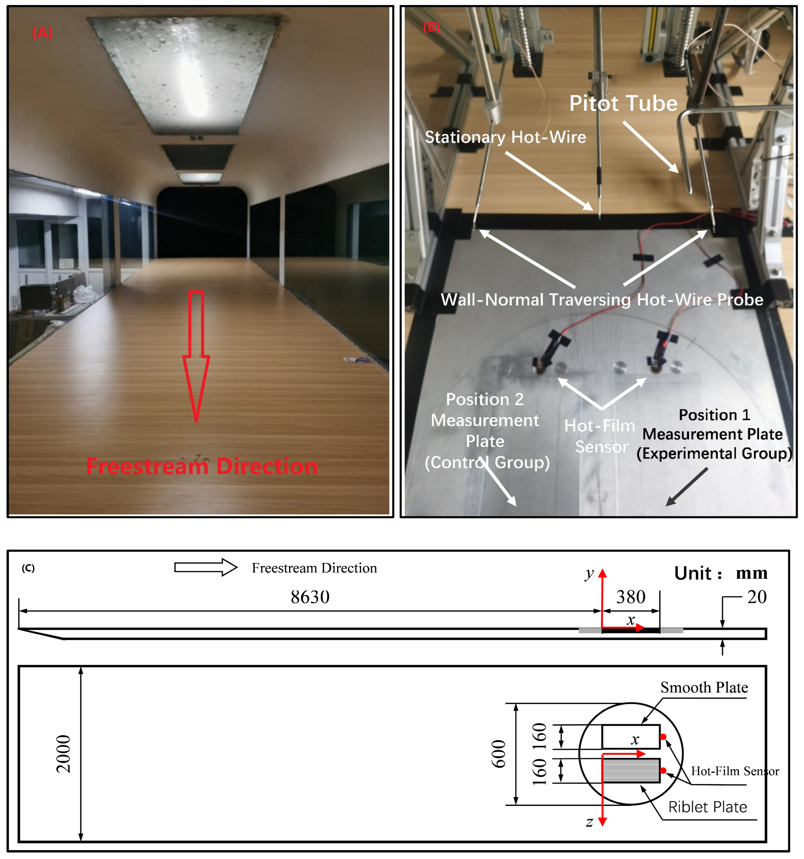 Figure 1, two measurement positions were designed in this experiment, enabling the following measurement protocol: during preliminary measurements, both positions are equipped with smooth flat plates. Subsequently, the smooth plate at Position 1 is replaced with a riblet-mounted plate, while Position 2 remains equipped with the smooth plate. This configuration offers the advantage of monitoring temporal variations in wall shear stress through repetitive measurements at Position 2. Given that the drag reduction rate of riblet surfaces typically ranges from 5% to 10%, this arrangement effectively eliminates the influence of freestream velocity fluctuations in the wind tunnel, thereby enhancing both the accuracy and efficiency of drag reduction rate measurements.
