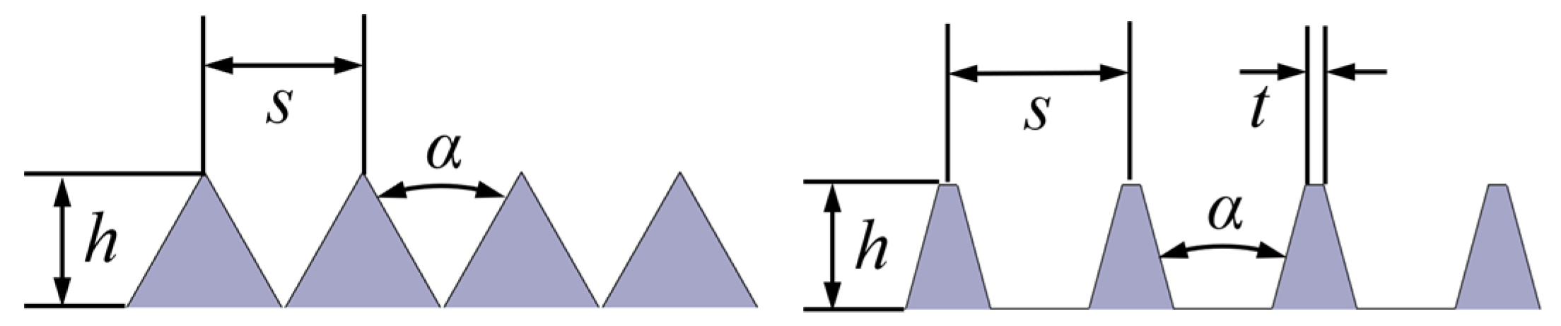 5] from NASA Langley Research Center in the 1980s, researchers have conducted extensive experimental and numerical simulation studies on this subject. Results demonstrate that triangular riblets with equal dimensionless height and width exhibit optimal drag reduction performance among various riblet configurations [