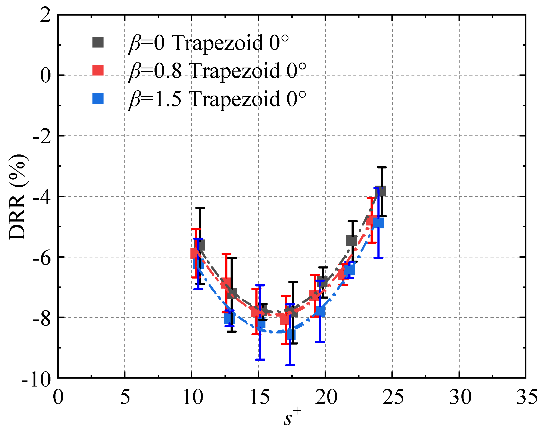 27], while the trapezoidal riblets show a comparatively lower drag reduction efficiency. Moreover, the peak drag reduction for trapezoidal riblets occurs at a lower dimensionless spacing