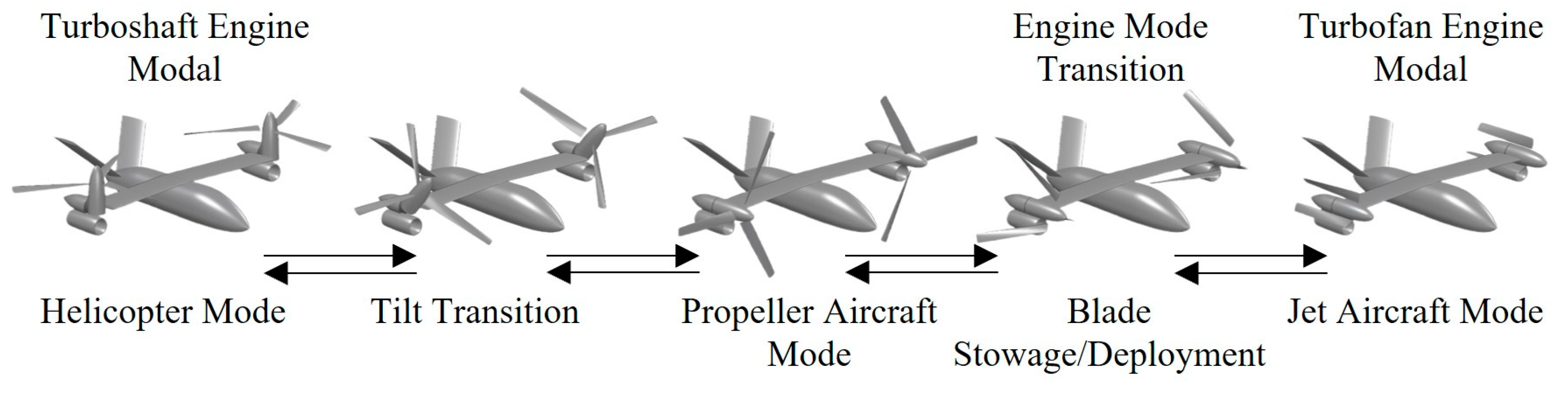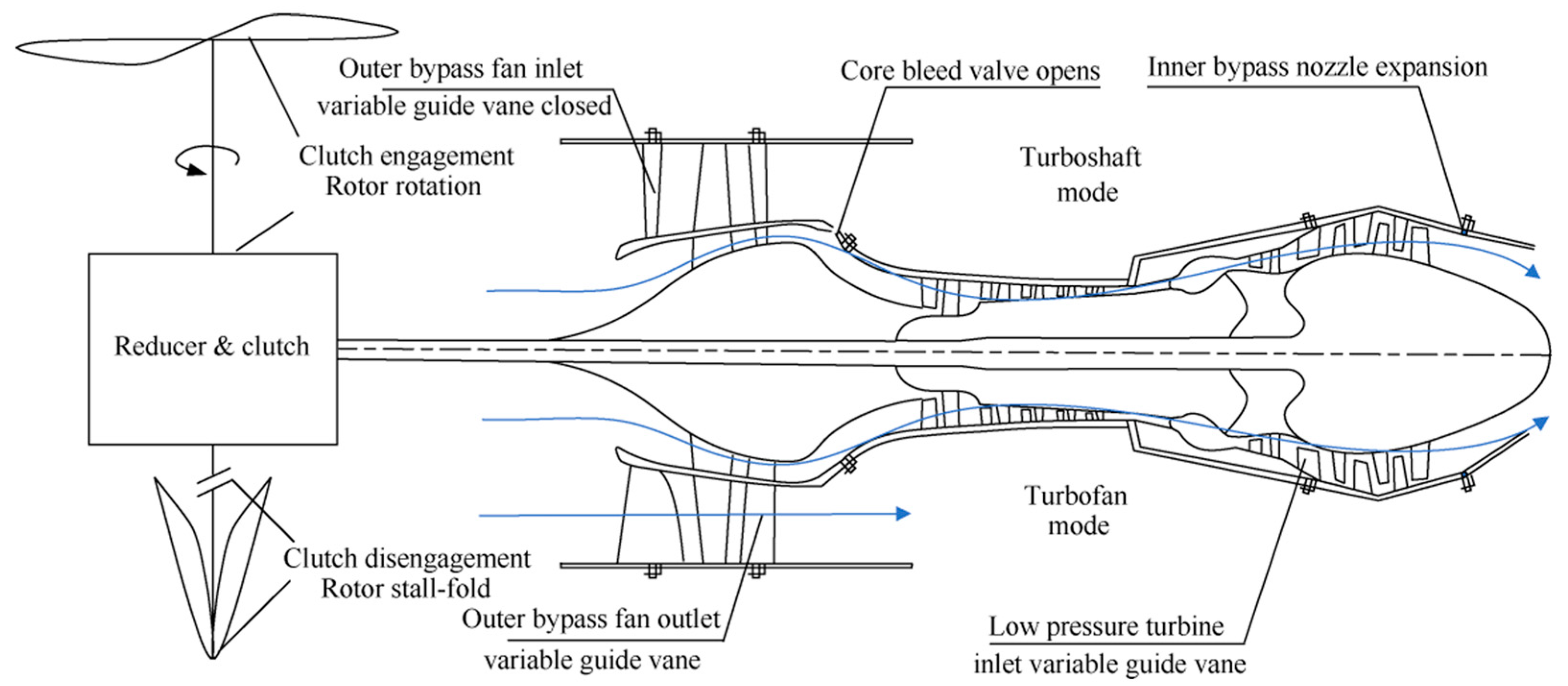- Engine Mode Transition: mutual switching between the engine’s turboshaft and turbofan modes;