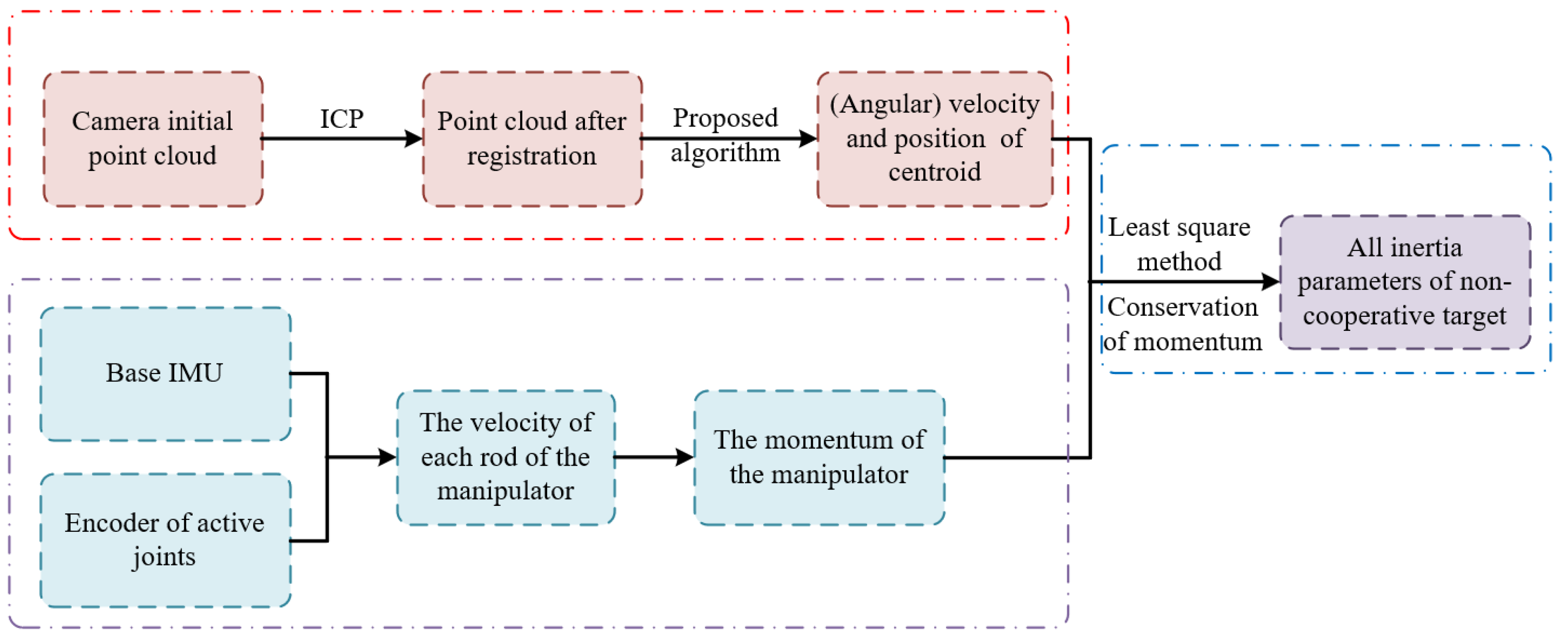 6]. Depending on the nature of the target, these missions can be classified into operations involving cooperative targets and non-cooperative targets. Missions involving non-cooperative targets are considerably more challenging due to the lack of cooperation from the targets. In addition, the unknown physical parameters of such targets result in uncertain dynamics, thereby increasing the operational risks. Consequently, it is essential to identify the physical parameters—particularly the inertia parameters—prior to mission execution to ensure safety and reliability.