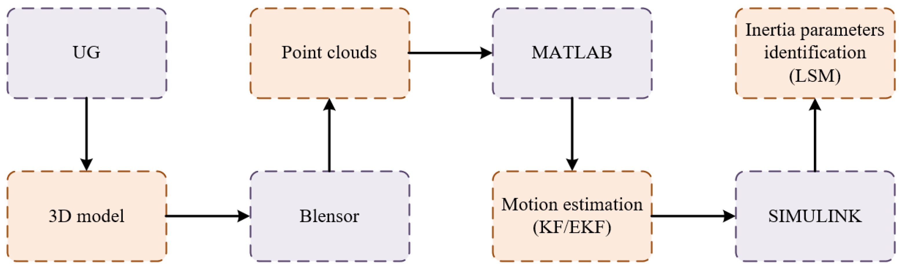 32] proposed an architecture for estimating dynamic states, geometric shapes, and model parameters; however, their approach can only identify the normalized principal moments of inertia. Richard et al. [