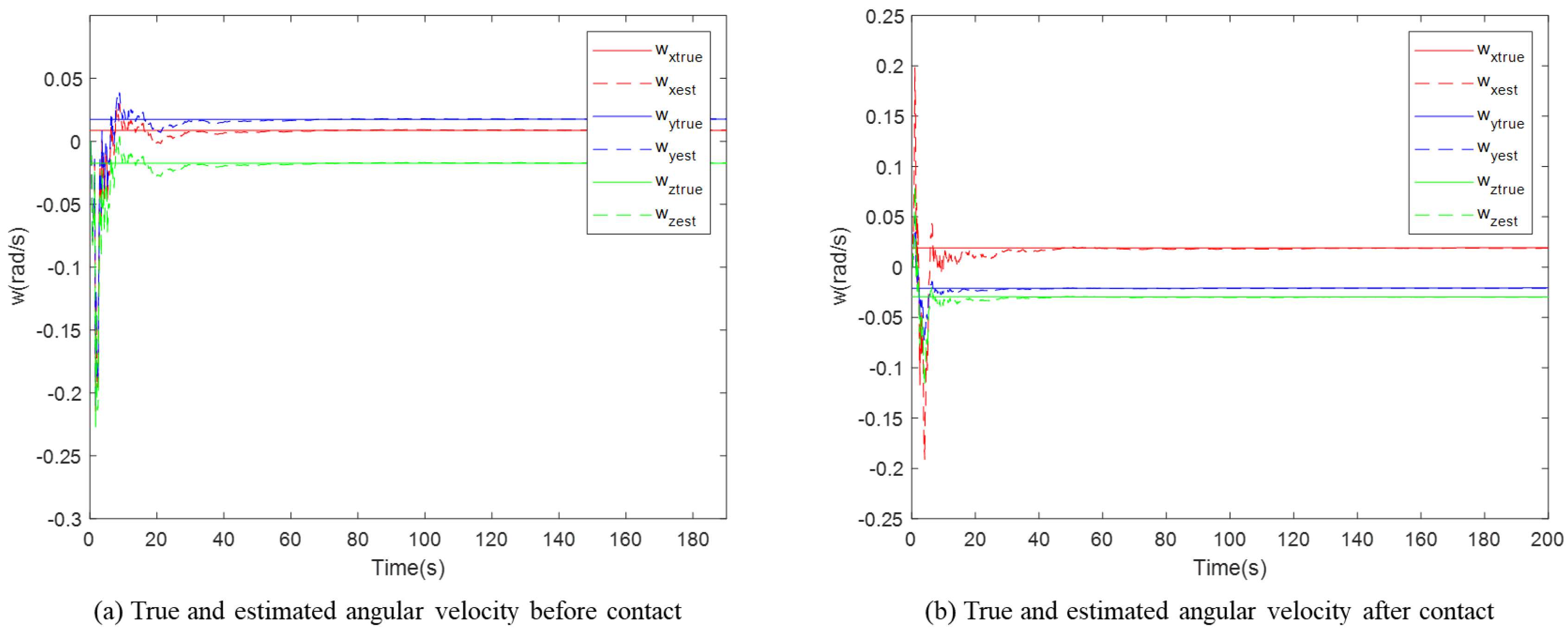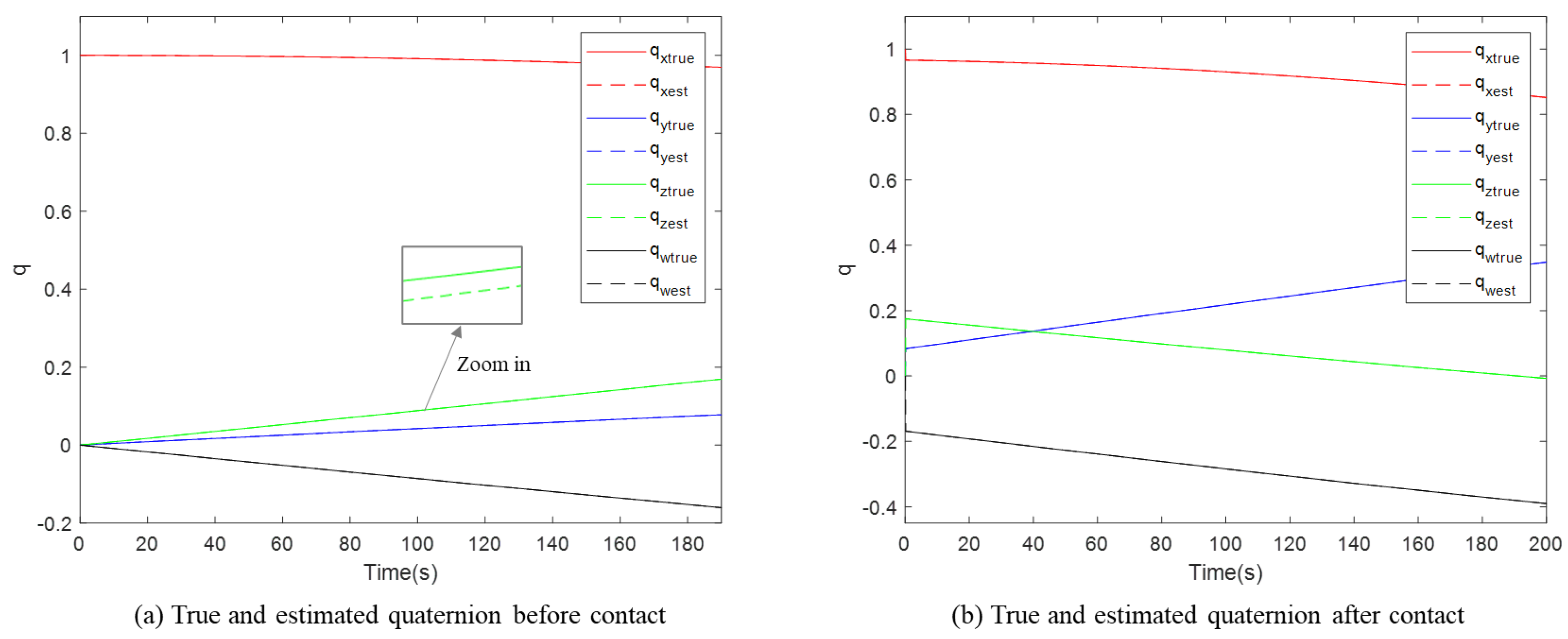 However, the principal moments of inertia along the three axes in this paper are assumed to be distinct. When two or all of them are identical, deduction will differ, and the proposed method may not be applicable. This limitation will be addressed in future work. On the other hand, the observation quaternion is assumed to be the same as that of the principal coordinate, which may not always be valid, especially when the mass distribution is non-uniform. And the situation when they are different is to be noted. In addition, this paper assumes that the inertia parameters of both the manipulator and the satellite are known. If these values contain extra errors, then momentum conservation equation may also be affected, which should be considered in subsequent studies.