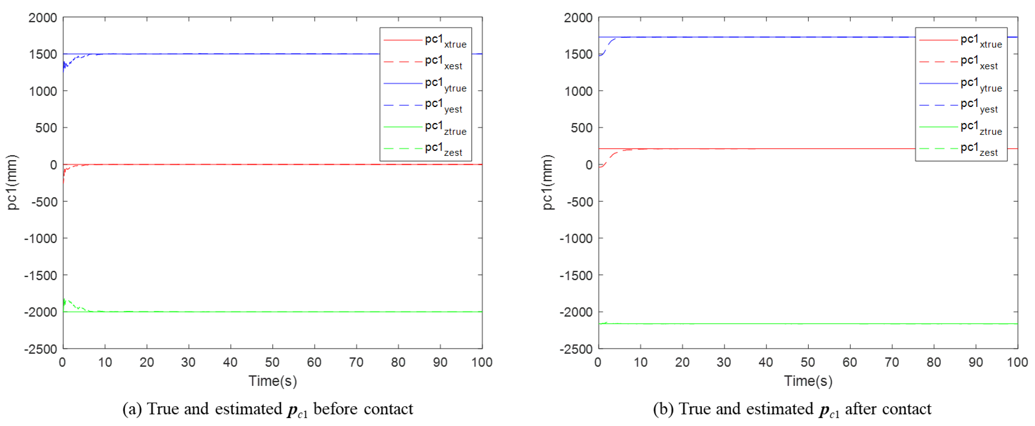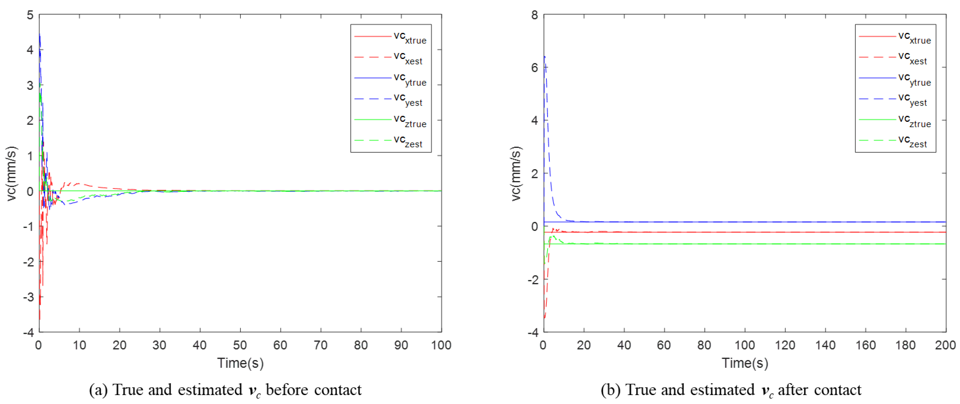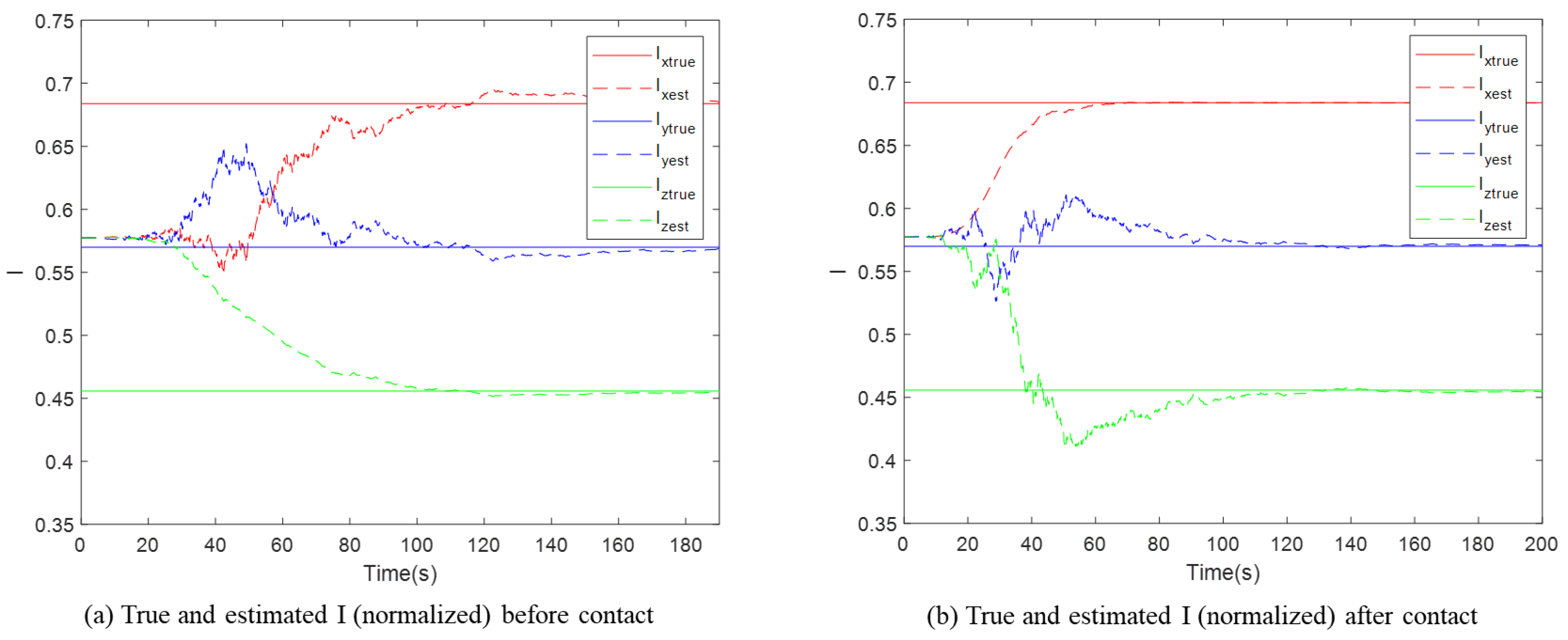 The position and velocity estimation combines the output of the ICP algorithm and with a novel modeling approach. In this period, only the initial position vector is identified, unlike conventional position estimation. The position at any subsequent time can be derived by the estimated velocity and elapsed time. Moreover, since the normalized principal moments of inertia can be estimated by visual data, the final LSM only contains two parameters to be identified. This significantly reduces the problem’s dimensionality compared with the six-dimensional output vector. For this reason, only one contact is sufficient to ensure the stability of the identification if all the errors are neglected.