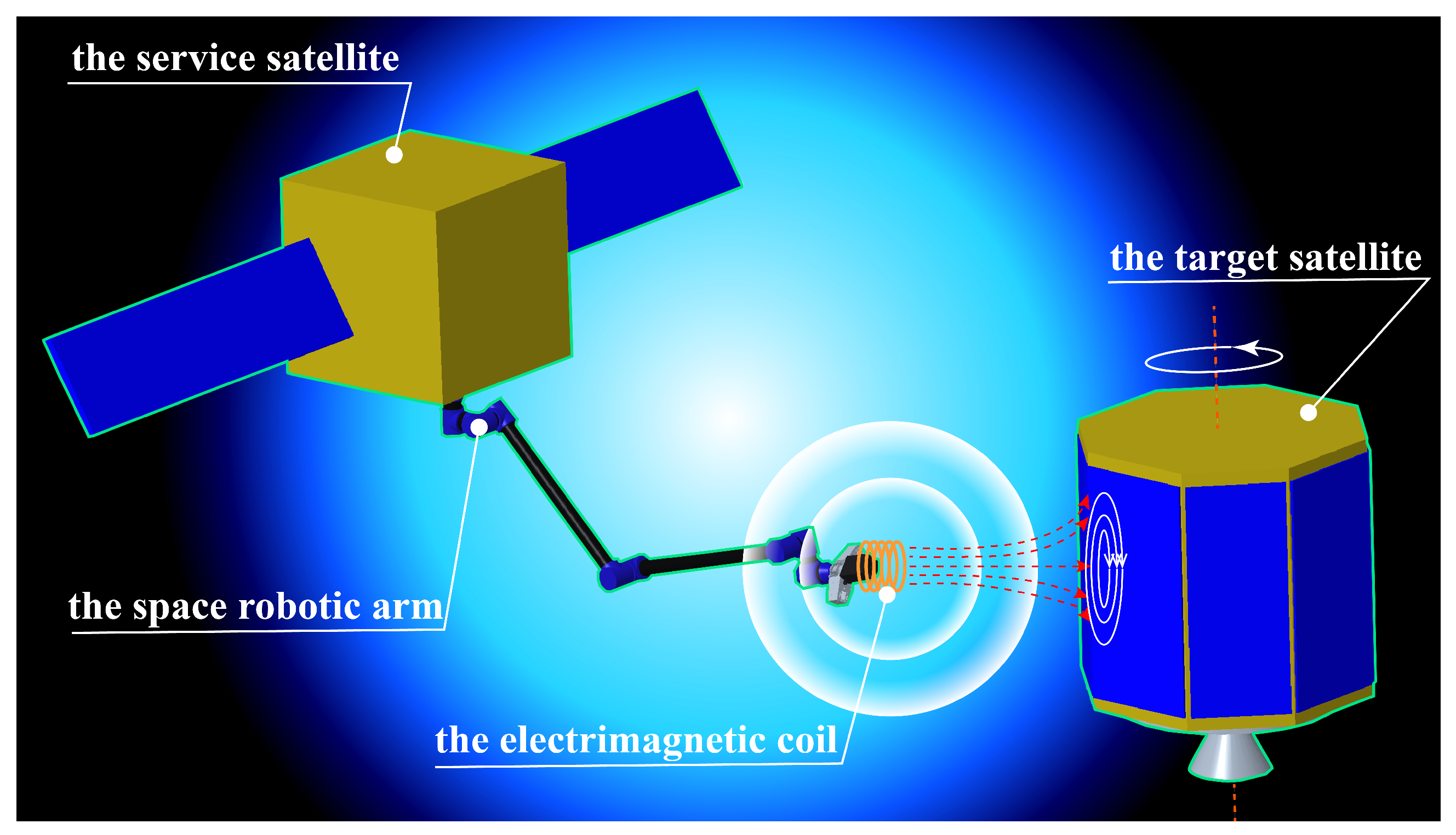 - Du, L.; Chen, Z.; Hu, H.; Liu, X.; Guo, Y. An Improved Uncooperative Space Target De-tumbling Method Using Electromagnetic De-tumbling Devices with AC Excitation. Adv. Space Res. 2025, 75, 1264–1276. [Google Scholar] [CrossRef]