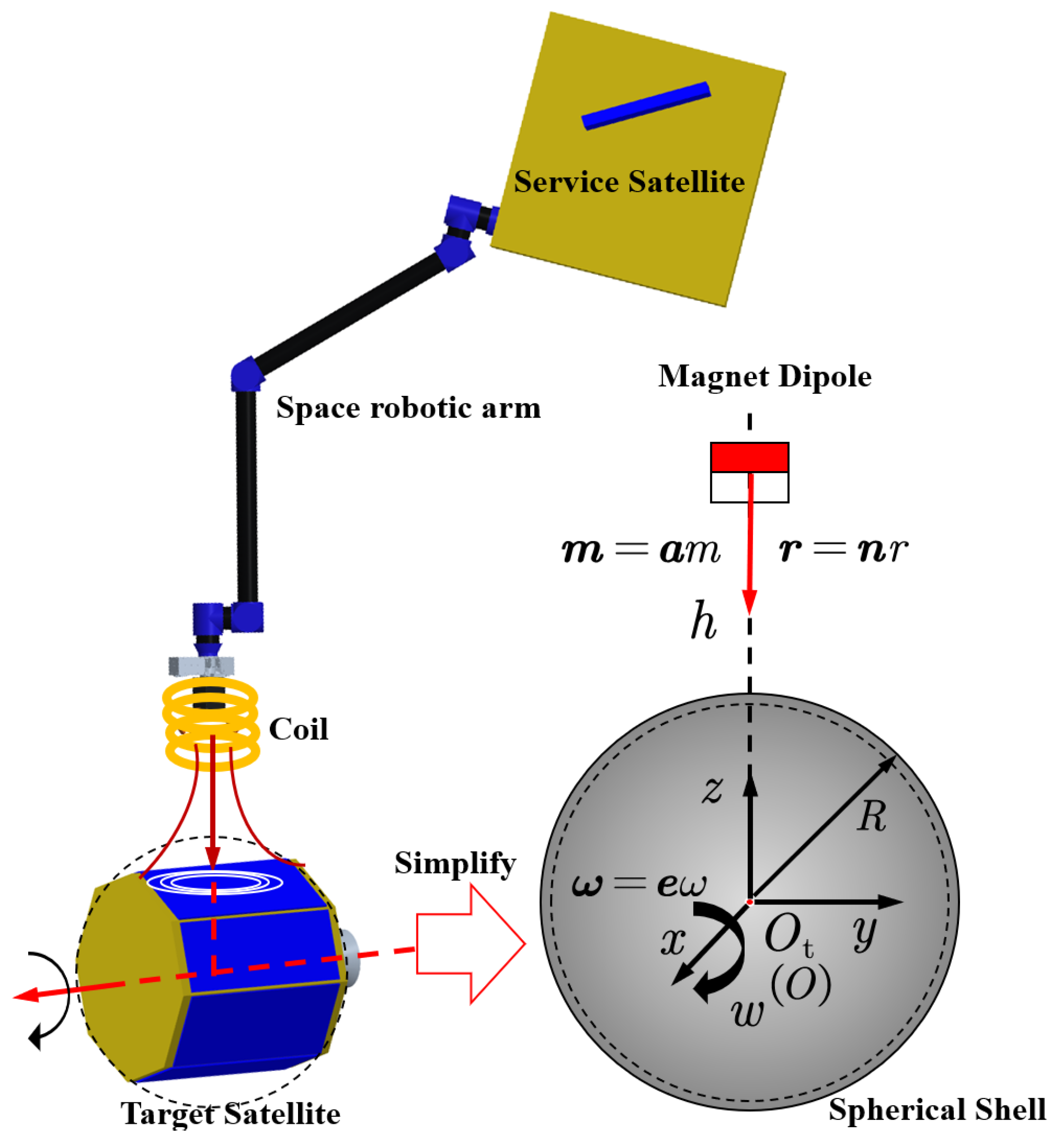 - Du, L.; Chen, Z.; Hu, H.; Zhao, J.; Liu, X.; Zhang, Q.; Zhang, K. Contactless De-tumbling of the Uncooperative Targets Using Arc-linear Electromagnetic Device. Adv. Space Res. 2022, 71, 3290–3300. [Google Scholar] [CrossRef]