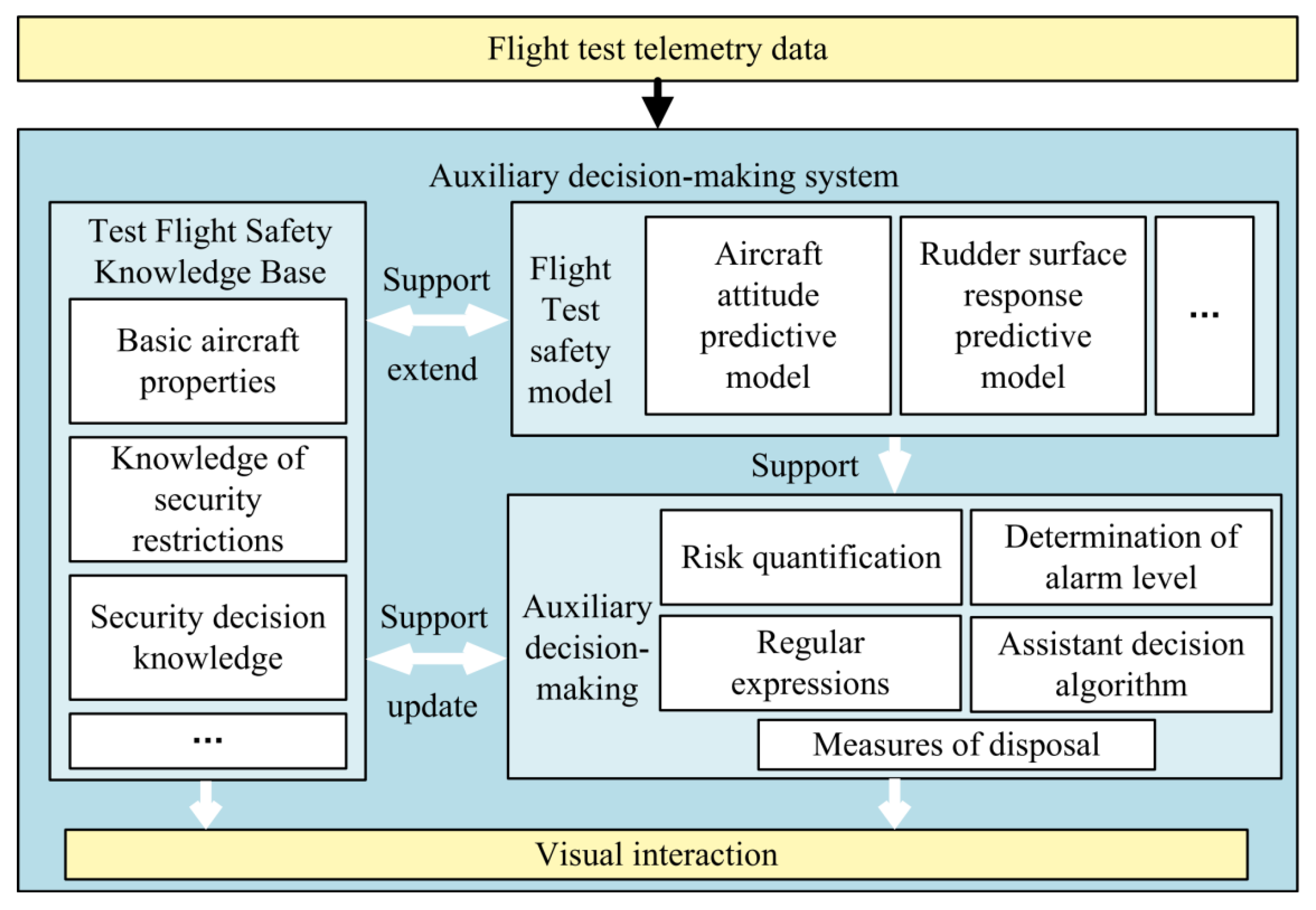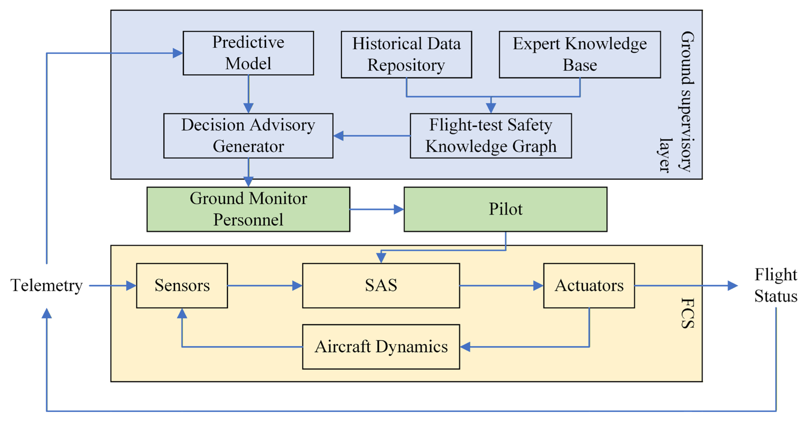 Figure 2. It is important to emphasize that this framework functions as an external supervisory decision-support system, primarily assisting ground monitoring personnel in assessing abnormal conditions and selecting appropriate response measures. The framework does not intervene in or modify the onboard closed-loop stability augmentation system (e.g., SAS), nor does it assume control authority over the aircraft. Instead, it provides predictive trends, risk assessments, and recommended actions as advisory information. Flight crew or ground personnel may choose whether to adopt these suggestions, and multiple valid recovery strategies may exist for the same abnormal condition. This separation ensures that the auxiliary system improves situational awareness and decision-making efficiency without interfering with the aircraft’s inherent stability control loops.