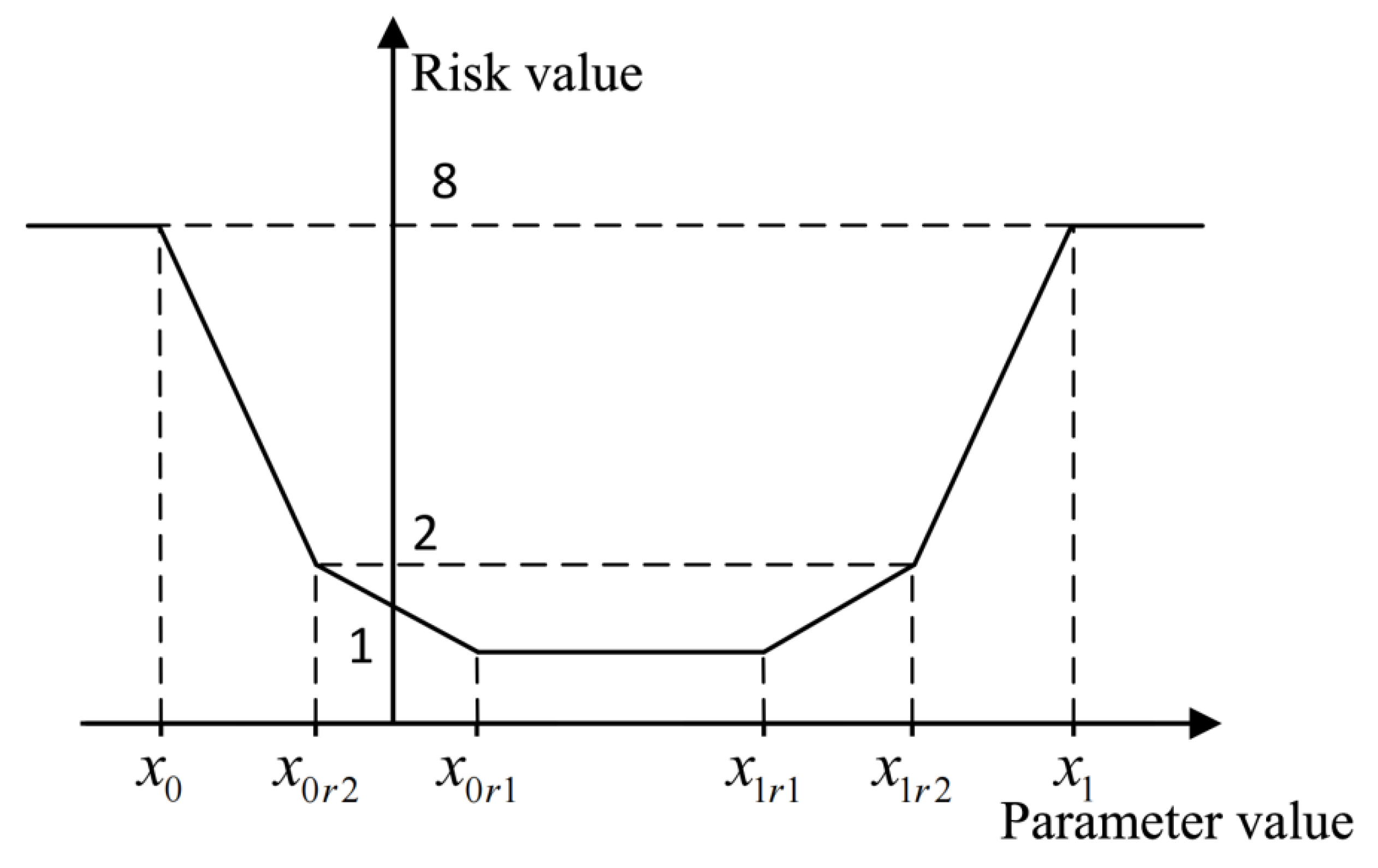 To address this issue, the risk value is designed as a piecewise linear function of the parameter limit interval. For instance, if the design limit interval of a key safety parameter