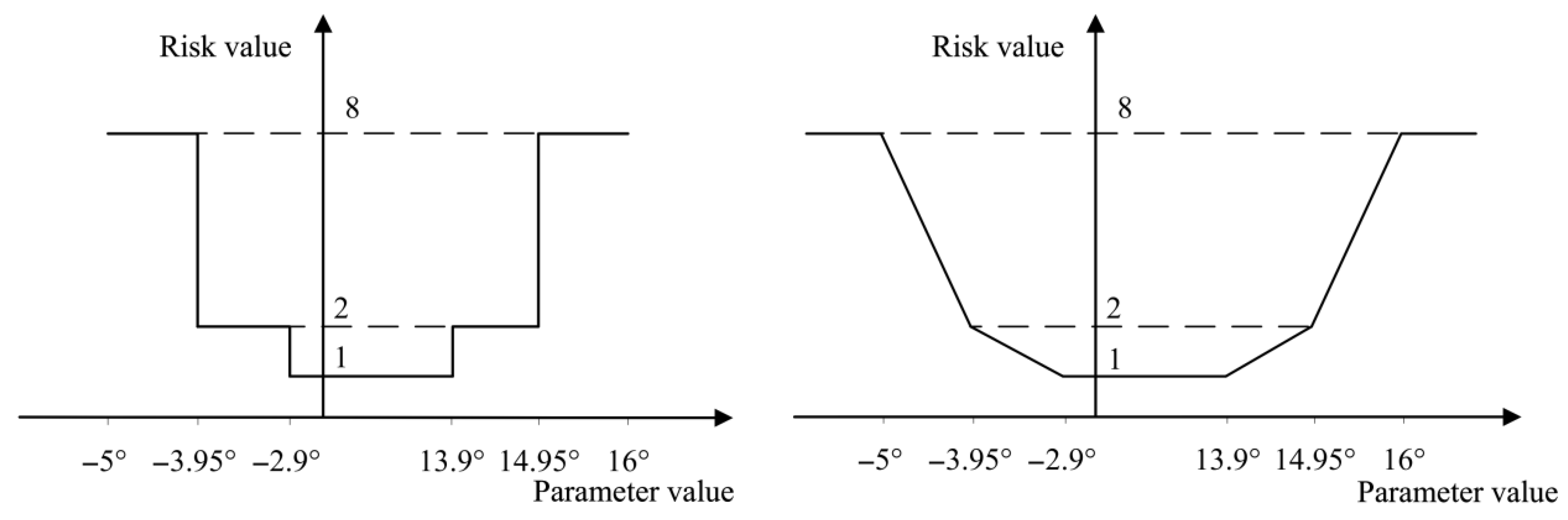 Figure 4. On the left side, the risk value is determined according to the parameter interval, and the risk value in the interval is constant. On the right side, the risk value is calculated by linear interpolation, and the parameter can also be identified when the parameter changes in the interval.