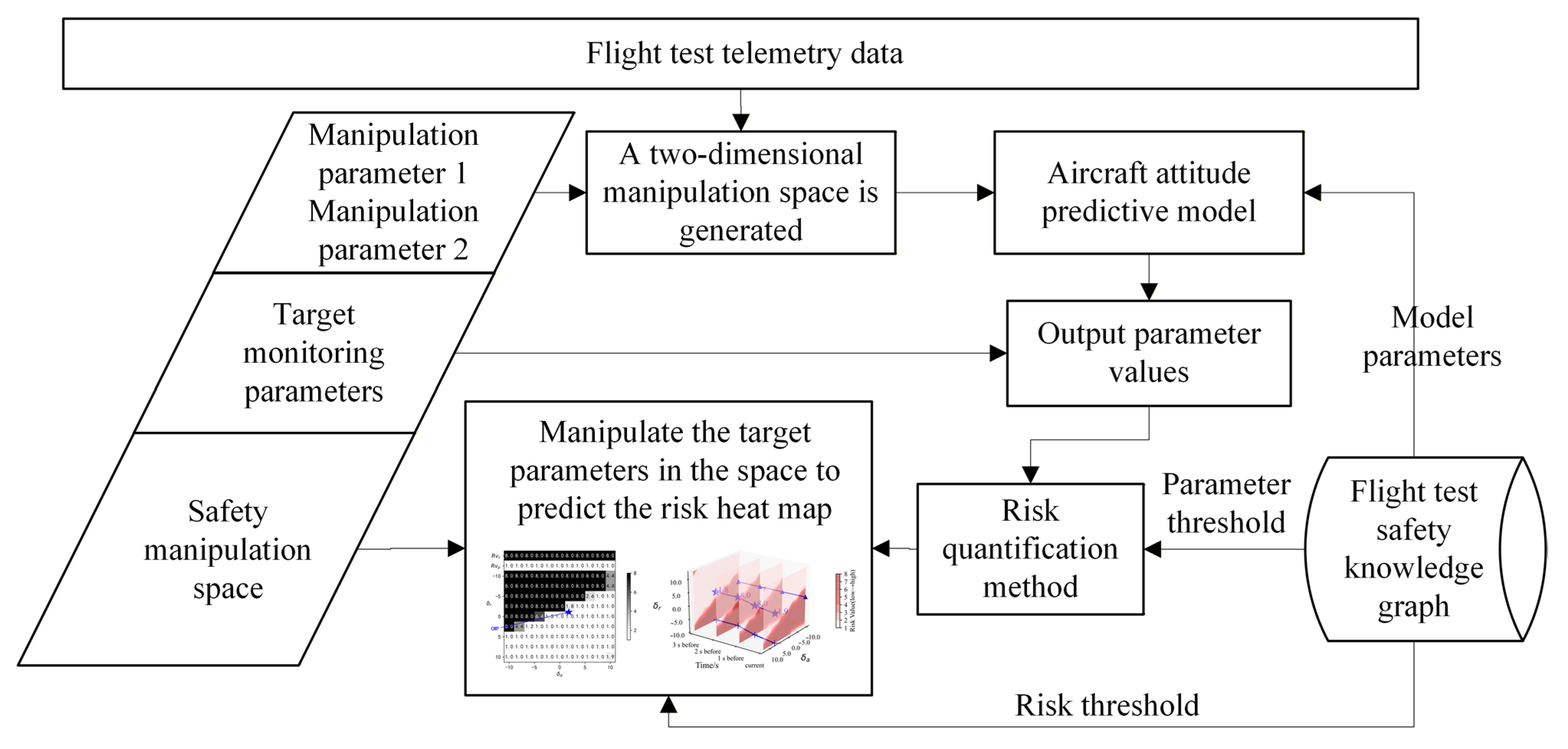 Figure 6, the flight test safety knowledge graph, aircraft attitude predictive model, and risk quantification method are combined to enhance the parameter risk perception ability and improve the efficiency and accuracy of auxiliary decision-making. In the aircraft safety manipulation space model, the target monitoring parameters are first determined, and two manipulation parameters that have an impact on the target monitoring parameters are selected. At the same time, the simulation telemetry data is received to determine the input data matrix. The data is input into the aircraft attitude predictive model to obtain the target monitoring parameter value matrix, and then the risk value of the target parameter value matrix is calculated by the risk quantification method. The parameters required by the aircraft attitude predictive model and the target parameter thresholds required by the risk quantification method are obtained from the flight test safety knowledge graph. After drawing the calculated risk value as the target parameter prediction risk heat map in the manipulation space, the specific aircraft safety manipulation space can be determined according to the risk threshold in the flight test safety knowledge graph, and the pilot control advice can be given combined with the aircraft safety manipulation space.