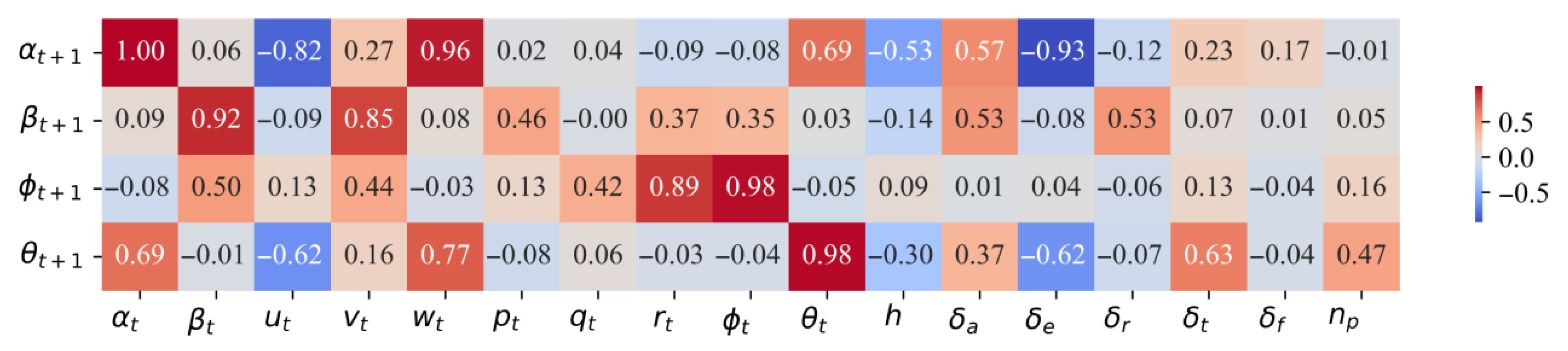 represent the angle of attack, sideslip angle, roll angle, pitch angle, altitude, aileron deflection, elevator deflection, rudder deflection, throttle, flap deflection, and engine speed, respectively. The figure clearly shows the correlation between these key flight parameters and the aircraft attitude variables (including angle of attack, sideslip angle, roll angle, and pitch angle). For example, the rudder and sideslip angle show a strong positive correlation (correlation coefficient of 0.79), and the elevator and angle of attack (correlation coefficient of −0.87) and the elevator and pitch angle (correlation coefficient of −0.51) show a strong negative correlation. The correlation between the flap and the attitude angle is relatively low, so the flap parameter is removed when building the model to reduce the impact of unnecessary parameters on the results.