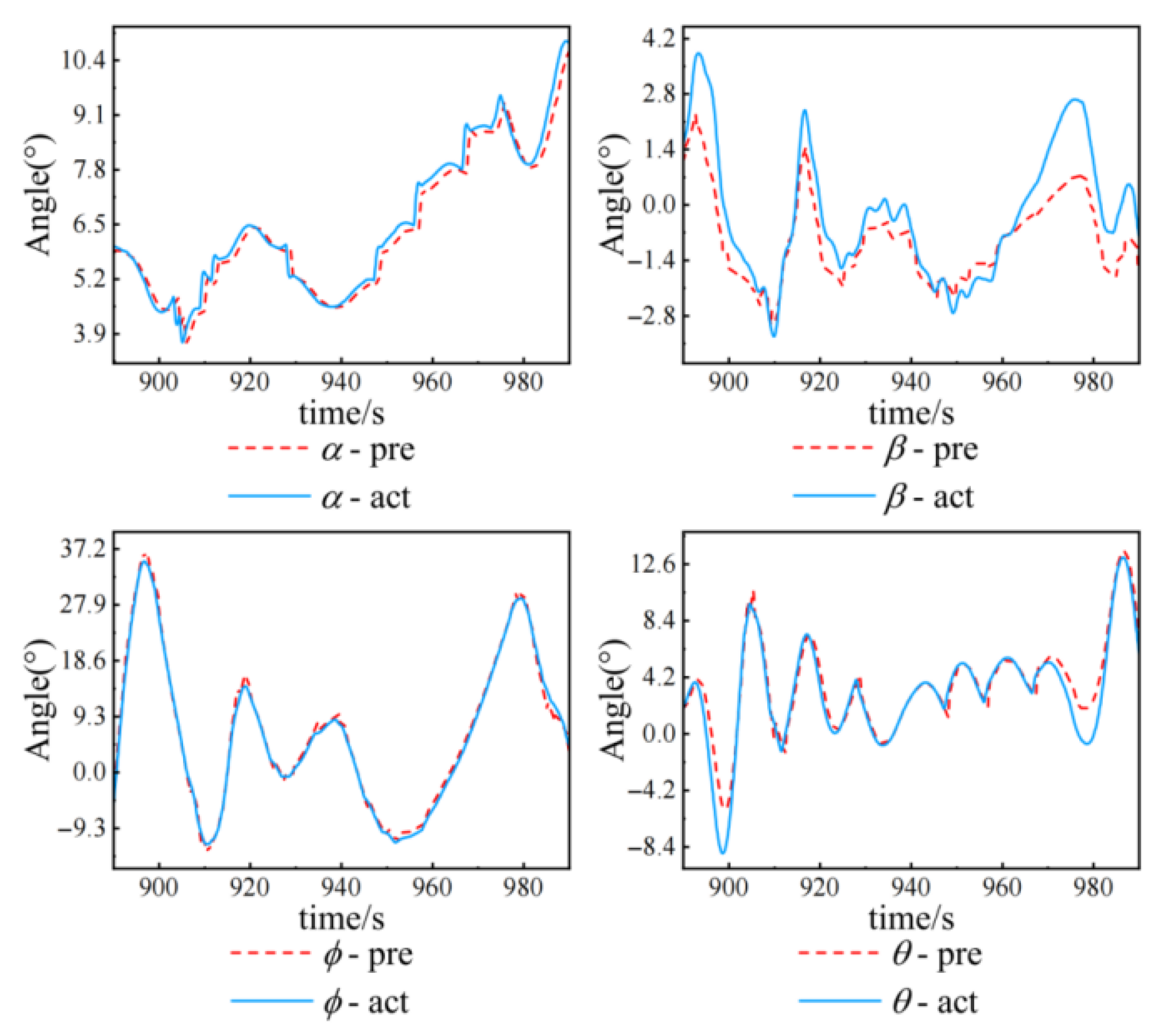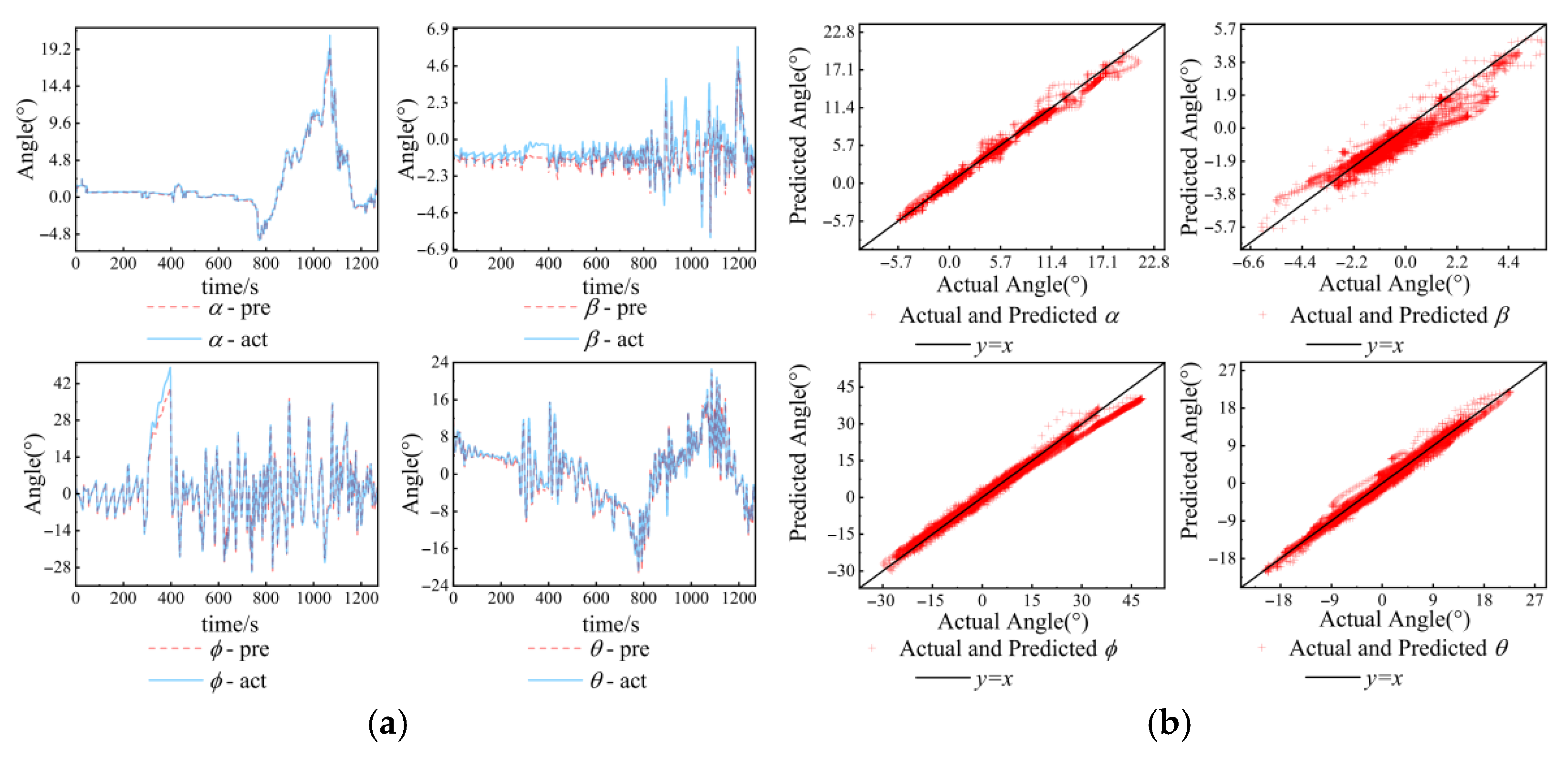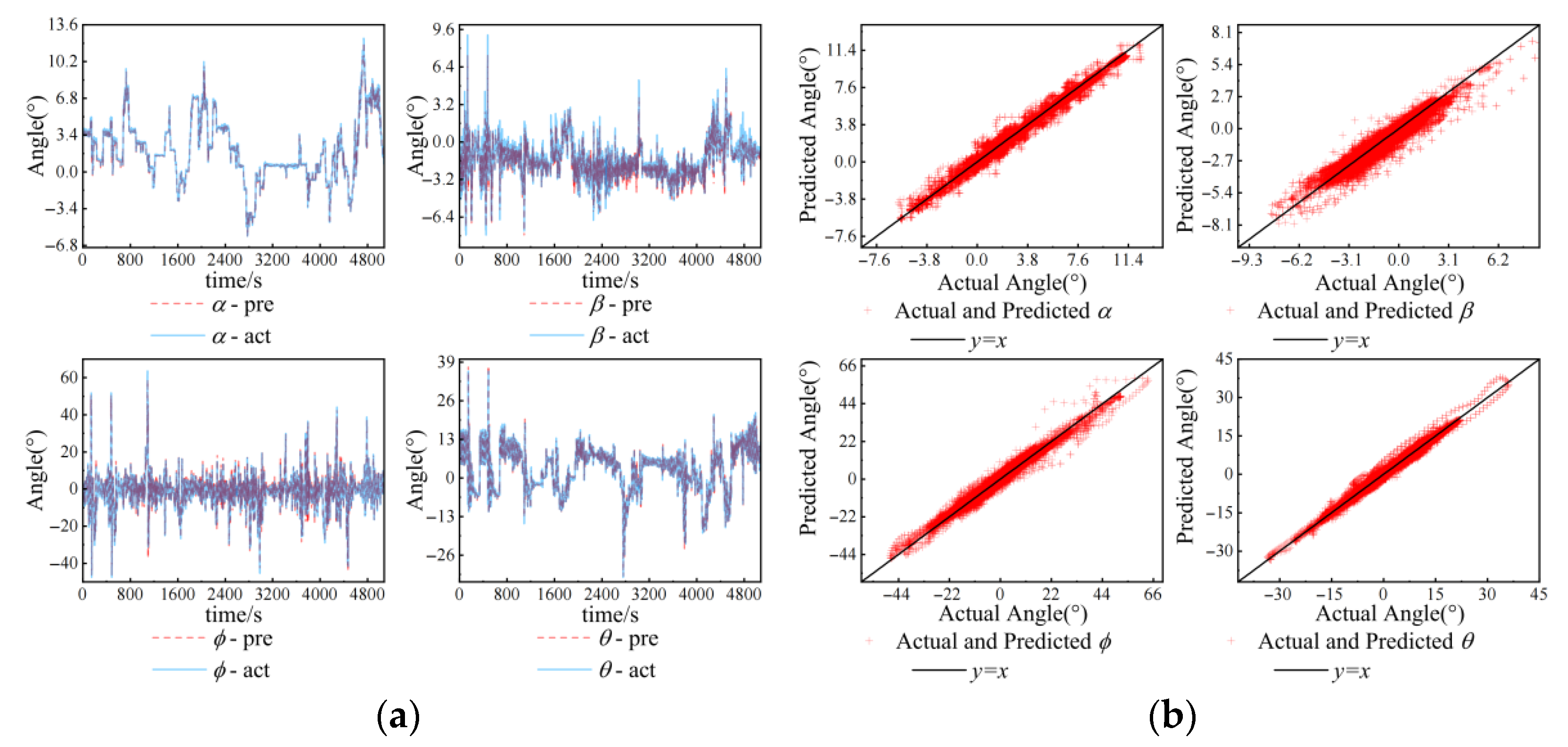 2 value is relatively low, showing weaker statistical fitting performance compared with other attitude parameters. On the whole, the model performs well in predicting attitude angles.