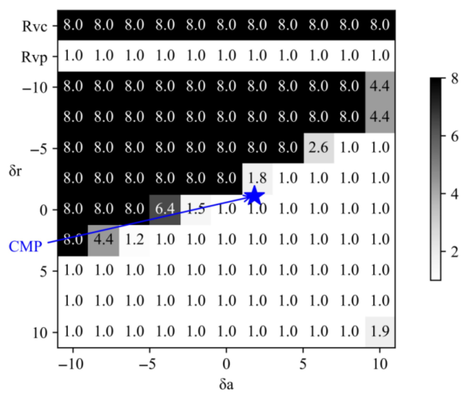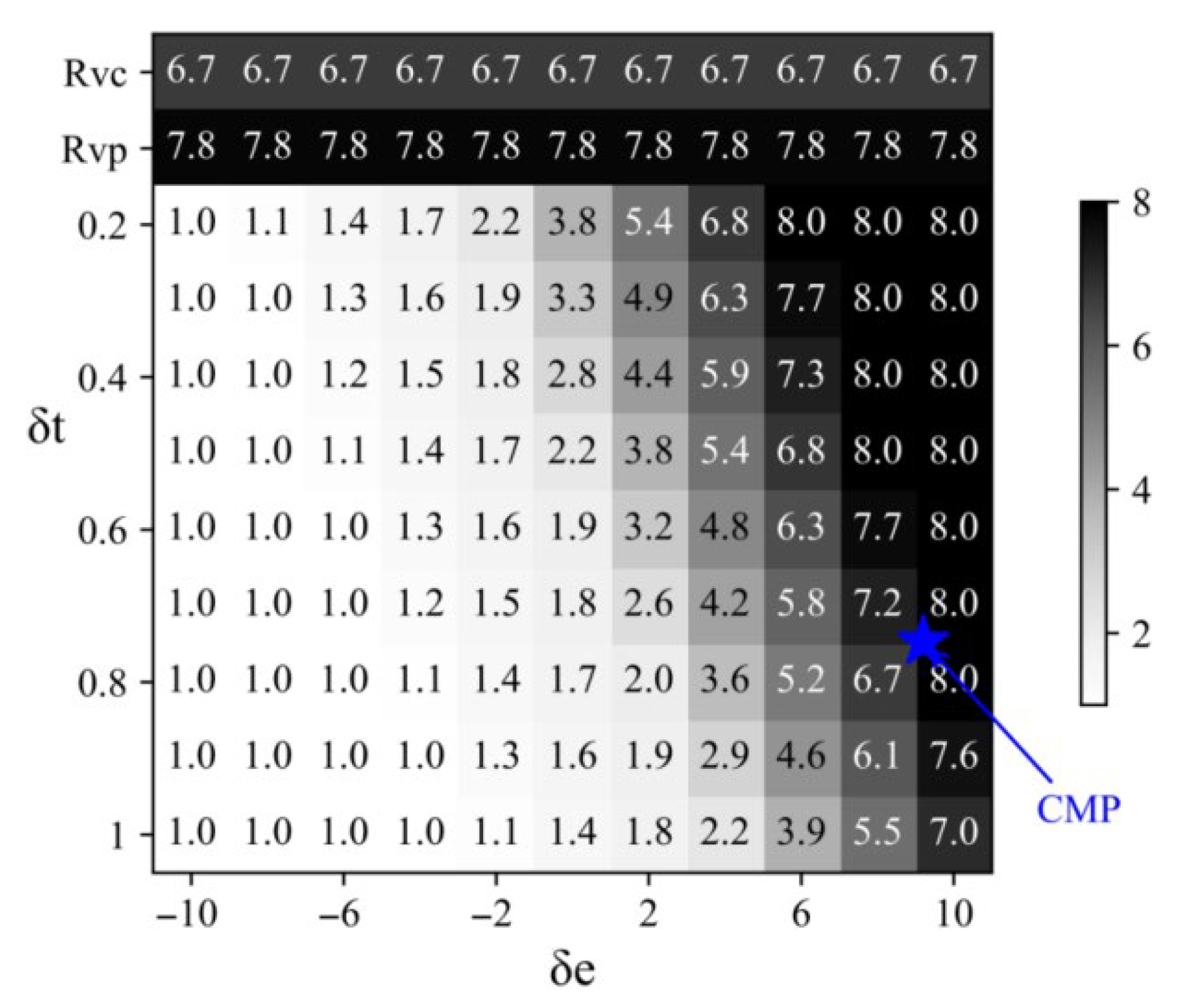 Considering that in the actual control process, except for the aircraft’s takeoff and landing process, the deflection angle of the aircraft’s control surfaces will not be too large, the selected manipulation space range here is limited. The selected elevator range is [−10, 10] degrees, and the throttle opening is set to [0.2, 1]. The blue star mark in the figure, which is indicated by the letter CMP, indicates the current position of the elevator and throttle control in the manipulation space. Based on this point’s position and the risk value heat map, the correct control direction can be clearly identified. It is easy to see that increasing the throttle and pulling the stick to make the elevator deflect upward can effectively reduce the risk of the angle of attack exceeding the lower limit. From the heat map, it can be seen that the correct control of the elevator is more crucial for reducing the risk value. Returning the elevator to the neutral position can reduce the risk value to a relatively low level, while increasing the throttle at this time has a slightly worse effect; even if the throttle is increased to the maximum, the risk value is still quite large. If the angle of attack risk value does not exceed 4, which is set as the safe range, then the specific safe control range of the throttle and elevator when the angle of attack risk value is in a safe state can be given.