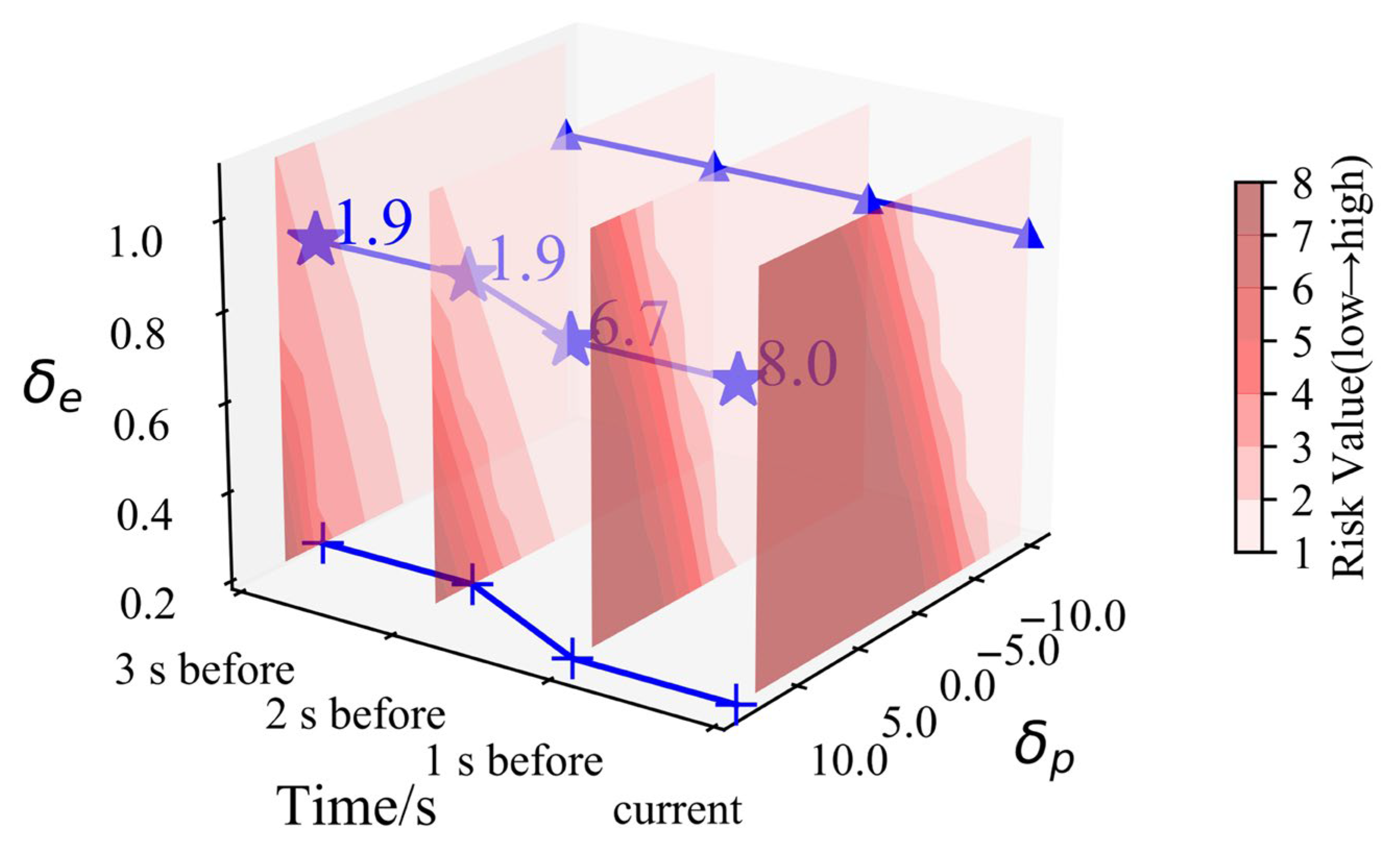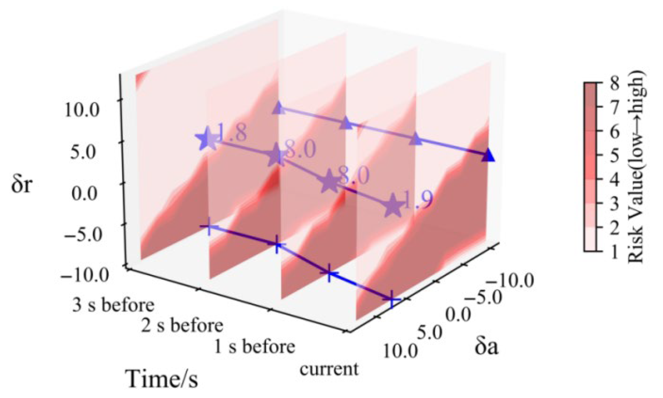 Figure 16, mainly including the current and the previous three seconds’ time series heat maps, which are updated in real time during safety monitoring. The blue star marks indicate the control points in the manipulation space at the corresponding moment, with the values corresponding to the real-time risk values. The blue triangular marks indicate the throttle opening values that change over time, and within this time period, the throttle opening has almost no change; the blue plus marks indicate the elevator deflection angles that change over time, and as the elevator deflection angle increases, the angle of attack risk value rises sharply. From the three-dimensional heat map, it can be seen how the risk value changes with the manipulation quantity, which is convenient for analyzing the influence of historical manipulation on the risk value.