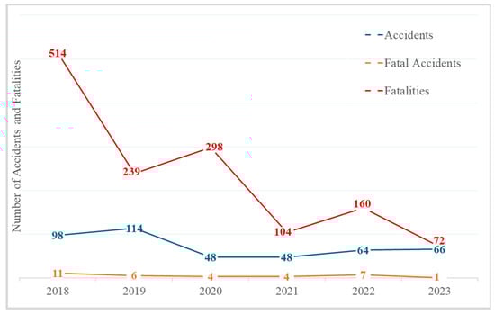 Accidents and fatalities trend (2018–2023) (adapted from []).