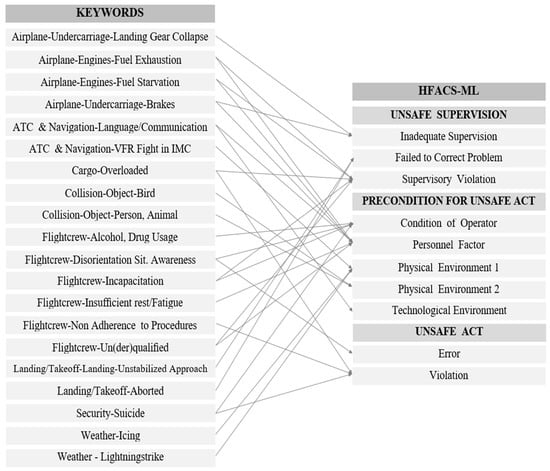 The labeling of the data for the evaluation of the predictive classification models was done automatically, first, and then manually. The keywords found in the documents provided by the database were automatically processed, observing at least 20 random reports to assess the consistency (of the majority) of tags related to the different HFACS-ML levels and categories, as illustrated by the schematization presented in Figure 3. The irregular samples identified were corrected manually.