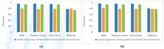 As to the unsafe act, results show greater homogeneity among classifiers. Here, it turns out that KNN again demonstrated to be the best-performing classifier utilizing Bayesian Optimization: it obtained a precision of 0.91 and a recall of 0.94, while maintaining a solid consistency compared to the other classifiers and its own performance at other levels. Almost identical performance, but with slight variations, is found in the RF and ET classifiers, for both optimization methods. A curious fact concerns the performance of XGBoost, which, despite improving over Grid Search (with precision from 0.76 to 0.80), proves to be the classifier that so far has the lowest performance for this category. Figure 6a,b illustrate the overall performance of classifiers in both optimization methods.