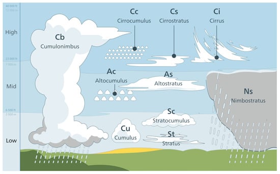 Identifying the cloud type is fundamental for assessing icing phenomena. Clouds may be broadly classified into two types: stratiform (layer clouds) and cumuliform (clouds with vertical development), primarily based on altitude and horizontal extent, as shown in Figure 2.