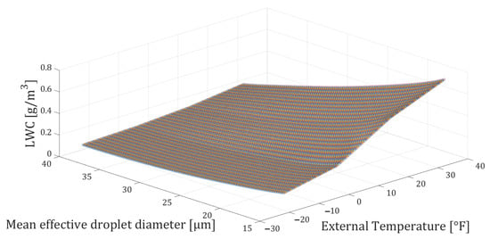 Within this regulation, a set of graphs is presented. Some depict continuous maximum icing conditions, associated with stratiform clouds, while others represent intermittent maximum icing conditions, i.e.,when the aircraft encounters cumuliform clouds. By utilizing software to digitize the graphs directly from their images, vectors can be extracted, each containing numerical data for MVD, LWC, and external temperature across all cloud types, including stratiform and cumuliform clouds with horizontal extensions ranging from 0.26 to 310 nmi. This process enables the generation of a 3D map (as shown in Figure 3) that includes all possible isotherms within the range of −30 °C to 0 °C, with a resolution of 0.25 °C. Such a fine temperature increment allows for a highly precise evaluation of LWC values corresponding to these isotherms.
