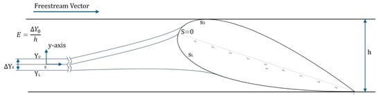 As described in Figure 6, E represents the fraction of liquid mass that crosses the Y axis within the frontal projection of the airfoil and subsequently impinges upon the airfoil surface. To make those values dimensionless, they are divided by the chord length. The non-dimensional parameter visualizes a segment along the Y axis with a length equivalent to one chord, centered at the projected location of the airfoil leading edge. represents the portion of liquid mass that crosses the Y axis within this segment and eventually interacts with the airfoil.