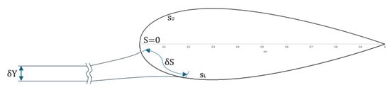 The maximum value assumed by on the airfoil surface is . It is maximum for symmetrical surfaces and corresponds to the limit value for an infinitesimal part of the wing area concentrated in the stagnation point. The function of this parameter will be clarified in Section 4.2, where it will be extensively used.