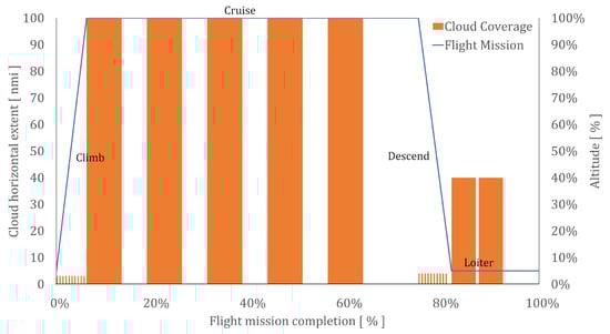 The cloud conditions and flight path are described in Table 5 and Figure 12. The cloud profile has been designed to set up a demonstration aiming at representing complex and challenging icing conditions. This approach allows for a better assessment of the ice protection system’s performance under difficult scenarios. To this end, the descent and climb phases—typically the most demanding in terms of aircraft performance—encounters with cumuliform clouds, which exhibit higher LWC values [] creating more complex flight conditions, were prioritized. This choice ensures a more significant presence of icing, enabling the evaluation of an anti-icing system that is conservative and robust, accounting for even the most severe conditions.