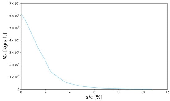 where c is the wing chord (in ft), is the free stream velocity (in kt), h is the projection of wing height depending on the angle of attack (dimensionless when divided by the chord value) obtainable from Figure 10, E is the total impingement (or collection) efficiency (dimensionless), and LWC is the liquid water content (in g/m3). The ṁ value should be multiplied by the wing span extension (in m) to obtain the contribution to the entire airfoil.