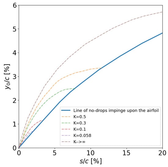 As the following results demonstrate, trajectories provide valuable insights into determining the mass flow rate of water impacting airfoils. The sensitivity of impact to droplet size is evident in Figure 4: on the left, the mass of water impacting the wing surface () peaks for larger droplet sizes, which is also observed on the right, where larger MVD results in larger ice formations. Peaks of enhanced impingement efficiency at the leading edge are particularly pronounced for larger droplet sizes (attributable to higher Stokes numbers). This phenomenon arises from the reduced inertia of smaller droplets, which causes them to follow the flow rather than collide with the wing surface. Conversely, scenarios with greater inertia lead to the development of larger ice formations, characterized by a more pronounced downward growth trajectory. This descent is further amplified by incoming droplets casting shadows on the region behind the leading edge [].