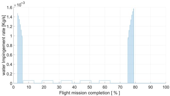 Another critical issue could be the time required to cross a cloud. In this model, when the aircraft encounters a cloud, it passes through it along its horizontal extension, and the crossing time is determined by its current speed. Crossing times may differ from those proposed in the NASA paper. Therefore, if LWC is imposed on the model without providing precise information on the cloud’s horizontal extension, the calculated crossing time may differ from those used in the NASA tests.
