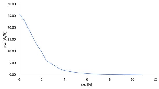 Transition from laminar to turbulent flow over the airfoil surfaces was assumed to occur at the point of laminar separation. In all instances, the separation point was located considerably downstream of the heated region. The literature suggests that the boundary layer remains laminar over the heated areas []. Therefore, if one considers only the surface between 0 and 10.8% of the chord, can be calculated according to the following []: