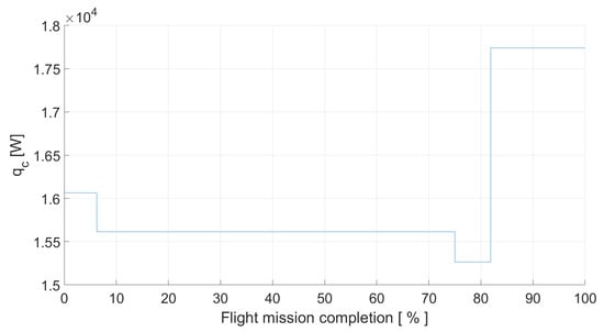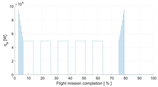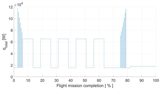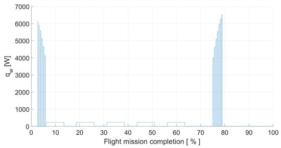 By summing all the previously calculated contributions in accordance with Equation (15), the curve in Figure 28 is obtained, which shows the total heat flux between the wing surface and the external environment as the aircraft completes an entire flight mission and encounters a cloud condition. This information is crucial for understanding the thermal power that an ice prevention system must provide to be effective. It is evident that such system must be capable of providing at least W of power, during peak conditions. This value appears to be consistent with those obtained by the literature on preliminary sizing of ice prevention systems, as in [].
