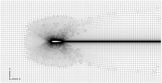 The computational domain extends 16 chord lengths (C) on the stream-wise direction and 8 chord lengths on the transverse direction. The current grid is designed adopting simulations of industrial flows where a hybrid unstructured grid is often employed; see Figure 1 and Figure 2. The well-refined cells are clustered around the whole surface of the aerofoil to obtain a fully resolved wall and well-resolved boundary layer; meanwhile, the outer region is constructed mainly using hexahedral cells with a coarser overall resolution. Regarding the span-wise extent , Zhang and Samtaney [] conducted a comprehensive study on a similar test case with a Reynolds number of via DNS. They found close predictions for the time-averaged aerodynamic quantities and velocity field, although the leading edge separation is found notably three-dimensional with a as large as 0.8 C. At the same time, Rodriguez et al. [] recommended that a DNS of C is good enough to capture the largest scales of motion in a full stall condition. The smallest DNS length, 0.1 C, was by Shan et al. []. Recently, a DNS and LES study was carried out by Smith and Ventikos []; their was set to 0.2 C. Frohlich et al. [] conducted a highly resolved LES study on a separated channel flow, pointing out that the span-wise length should essentially not effect the main flow features. Note that the computational cost and well-resolved span-wise scales of motion need to be compromised, despite the fact that a wider span-wise length may be preferable. C is therefore used in the current study, and the overall grid information for each reference case is summarized in Table 1.
